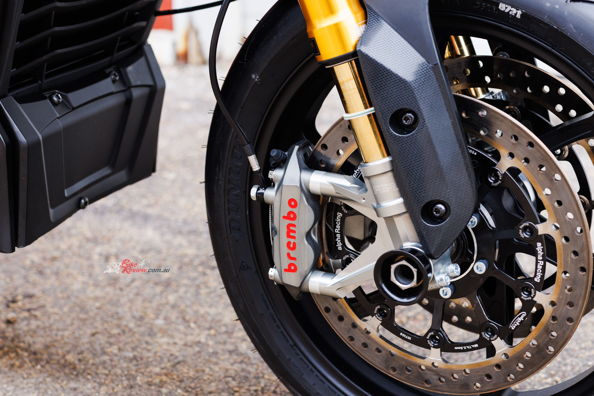 After much experimentation the stock Challenger’s original 19in front/16in rear wheels were eventually replaced by 17-inch British-made Dymag UP7X forged aluminium items, a 3.50in front and 6.00in rear shod with Dunlop control tyres. These wheels carry German-made 320mm Alpha Racing front brake discs gripped by Brembo Stylema radial monoblock calipers via a Galespeed 19×19 master cylinder, with a 10.5in/268mm US-made EBC steel wave rear disc with four-piston Hayes caliper and a Beringer master cylinder, operated on O’Hara’s machine via a thumb lever, but on the McWilliams racer with a conventional lever.