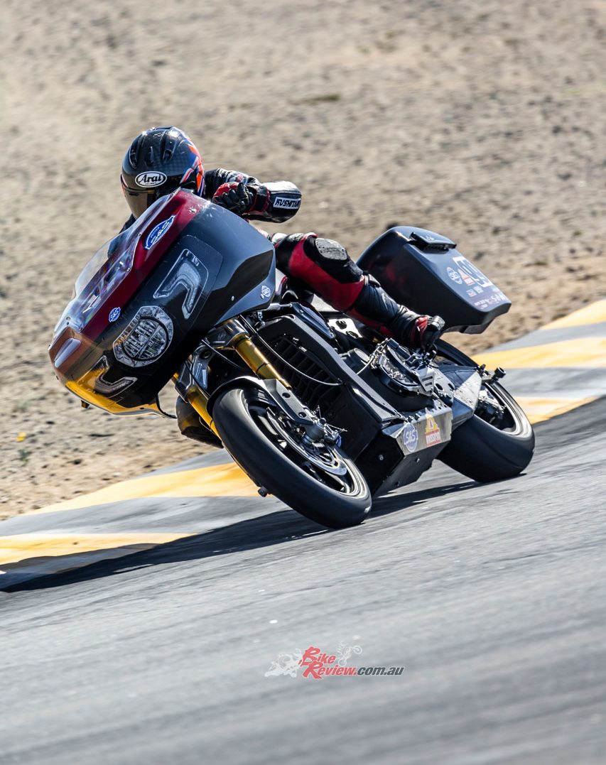 To stop them grounding at the incredible 60° lean angles Herfoss and O’Hara crank their SuperBaggers over to (against a stock 31°!) in maxing out turn speed…