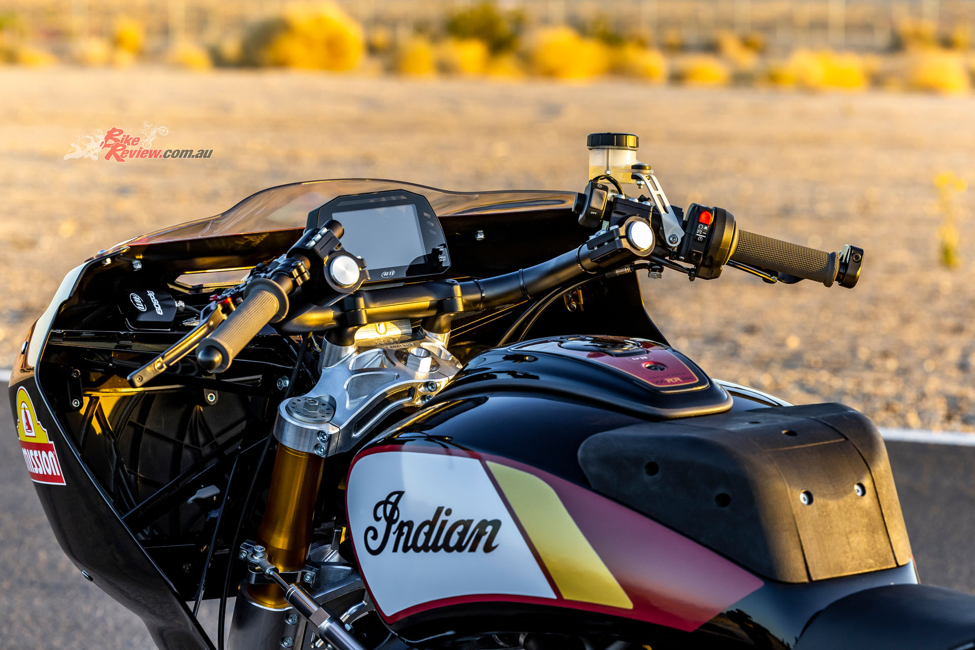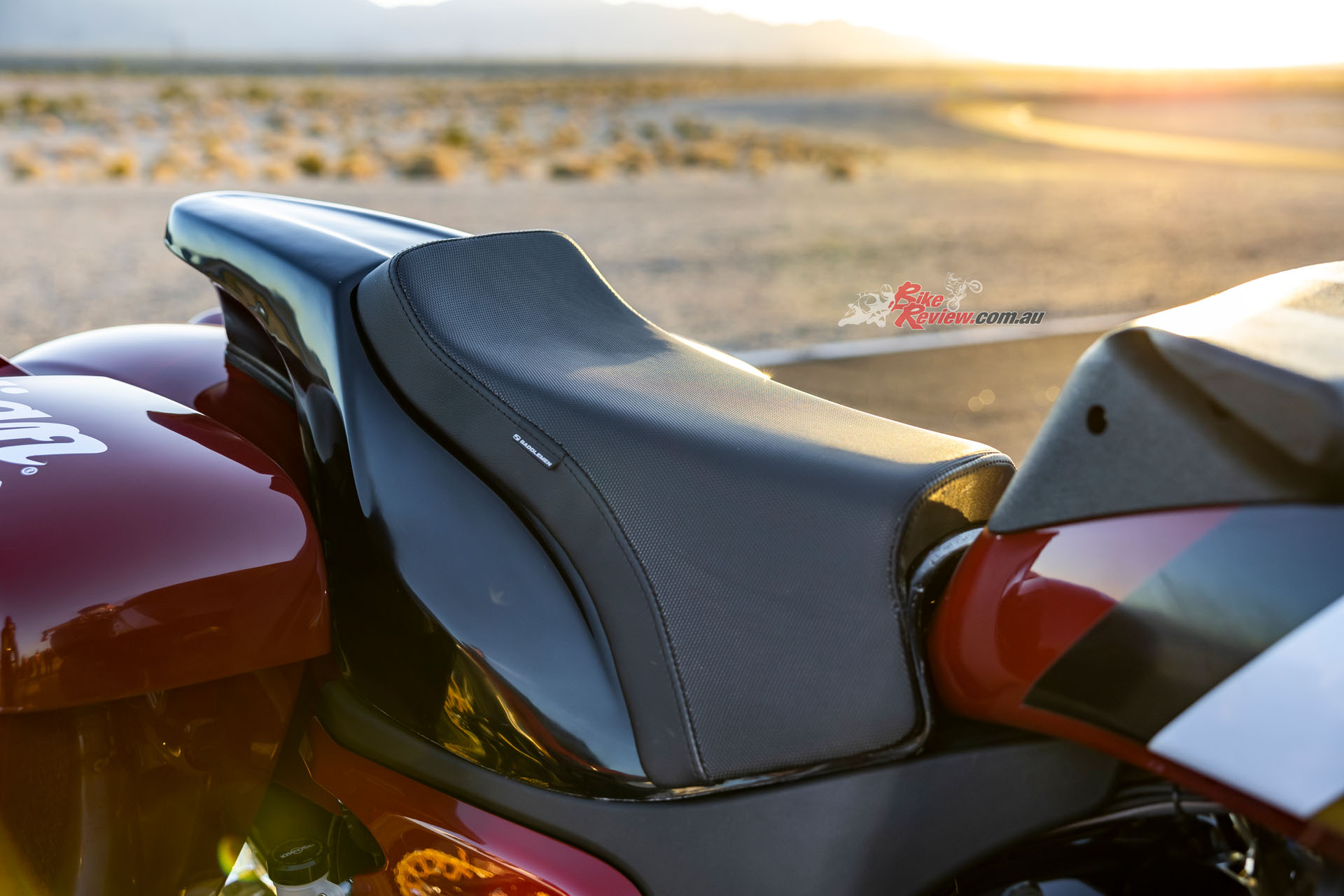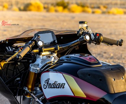 I had no worries this would be an issue for me in my five allotted laps on Jeremy McWilliams’ Daytona-winning bike, especially as it was my first time riding Chuckwalla’s flowing but featureless expanses, and the cold temperatures meant we had to run Dunlop Sportmax Q4 street rubber, rather than the usual slicks. Climbing aboard the SuperBagger’s custom Saddlemen race seat took quite a bit of doing – though this is set quite low, the Indian is pretty wide, thanks to the fuel tank shroud now encompassing the side-mounted throttle body on the right.