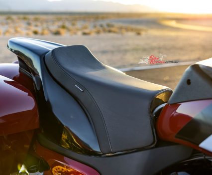 Reassuring, it’s not, even if the footrests must be that high to avoid grounding out when Troy and Tyler crank their Baggers over to the 60° lean angle they aim to obtain in keeping up turn speed, and at rest I could barely touch the ground with the toes of either boot. Once ensconced in the pretty wide, deep-mounted seat behind the thick rubber pad attached to the back of the tank, I realised the Bagger’s screen was ultra-minimalist – it merely acted as a wind deflector over the top of the AIM dash.