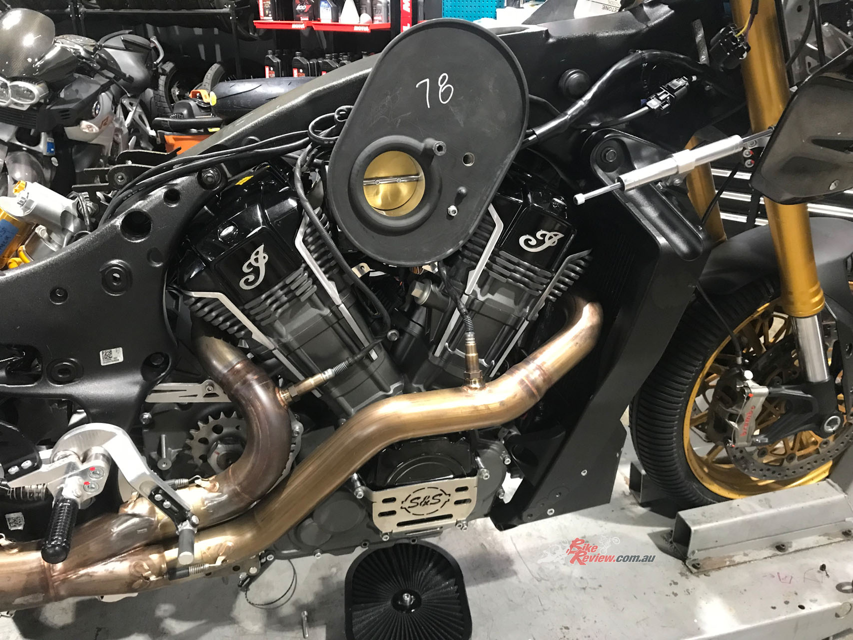 “A key element in this was the constantly evolving S&S 2-1 stainless steel exhaust with massive two-inch/51mm headers expanding to 2.5in/63.5mm in diameter”.