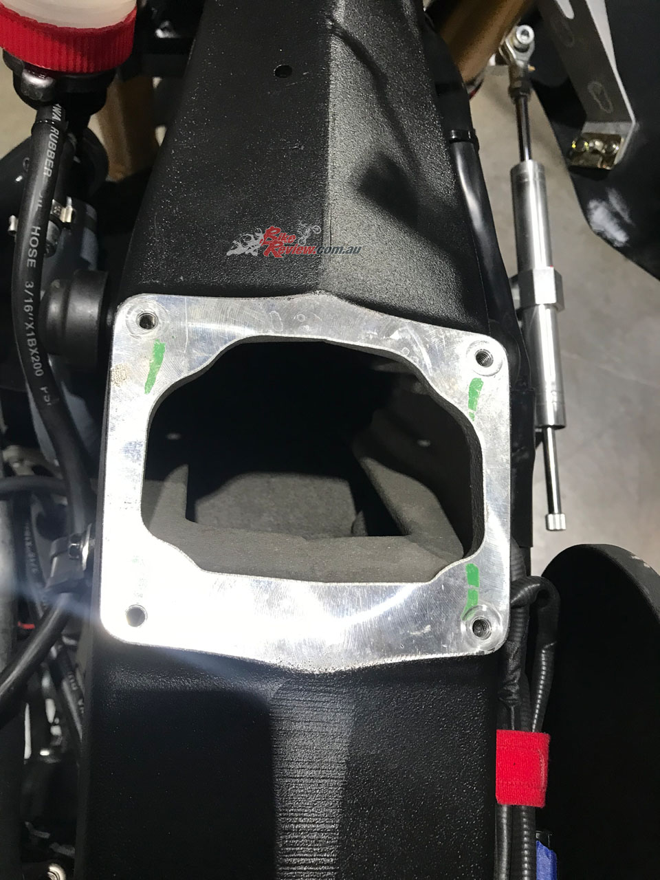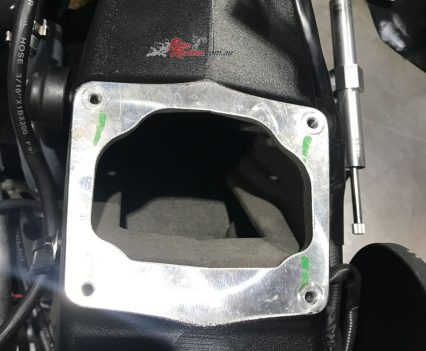 The problem is that the stock airbox is actually the frame backbone, so this restricted airflow in search of power. This led us to install this throttle body to replace the twin stock oval-section 52mm ones. It’s not ideal since there’s a big curve in it that points the throttle body out the side, but while having that bend isn’t great, it’s better than trying to breathe through the stock frame. Not using the frame as an airbox means we can stick ballast there – lead bricks fit in perfectly right where the air filter used to be!”
