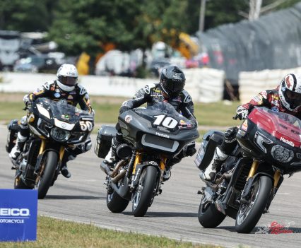 But in the past four years that rivalry has now been extended to what used to be called pavement racing back in the day, as America’s two oldest bike brands have fought each other to earn bragging rights to road racing’s King of the Baggers/KOTB crown, in the ultra-improbable but potentially very lucrative pursuit of going racing with tuned-up versions of their best-selling V-twin streetbike models supplied new with twin chassis-mounted luggage bags, and a fairing.