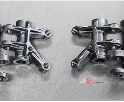 With the 39lb/17.70kg stock crankshaft lightened by a maximum of 10% of the original weight per KOTB rules, but with the main bearings locked in place for increased durability, this helps deliver a significant increase in power and torque for the liquid-cooled 60° V-twin motor with chain-driven SOHC, with ‘more than 190 bhp@7,700rpm’ which is already pretty respectable – but with humongous peak torque of ‘over 150ft/lb [203 Nm]@5,000rpm, which is something else entirely. Phew!