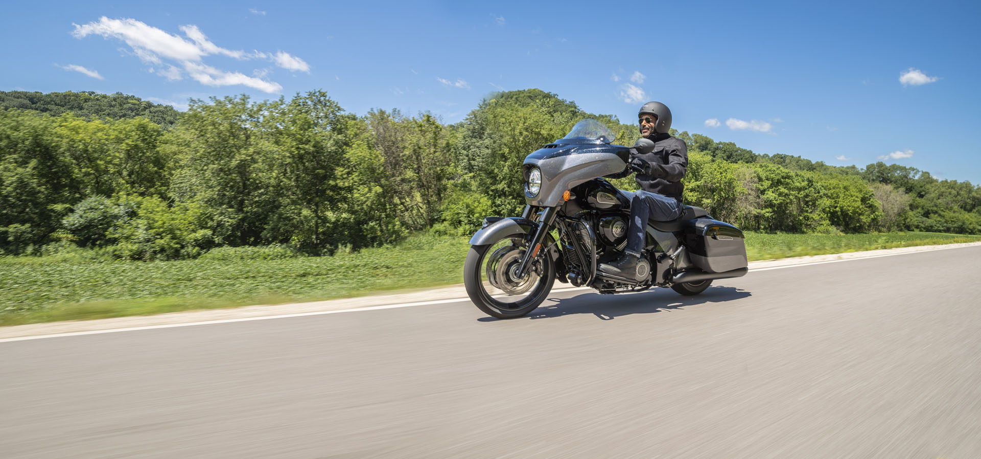 The Chieftain Elite’s premium two-tone Thunder Black Vivid Crystal over Carbon Crystal paint delivers a custom-inspired aesthetic. Premium finishes, such as the Thunderstroke 116’s Slate Smoke finish and color-matched badging throughout set the Chieftain Elite apart from any other bagger on the road.