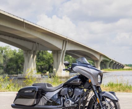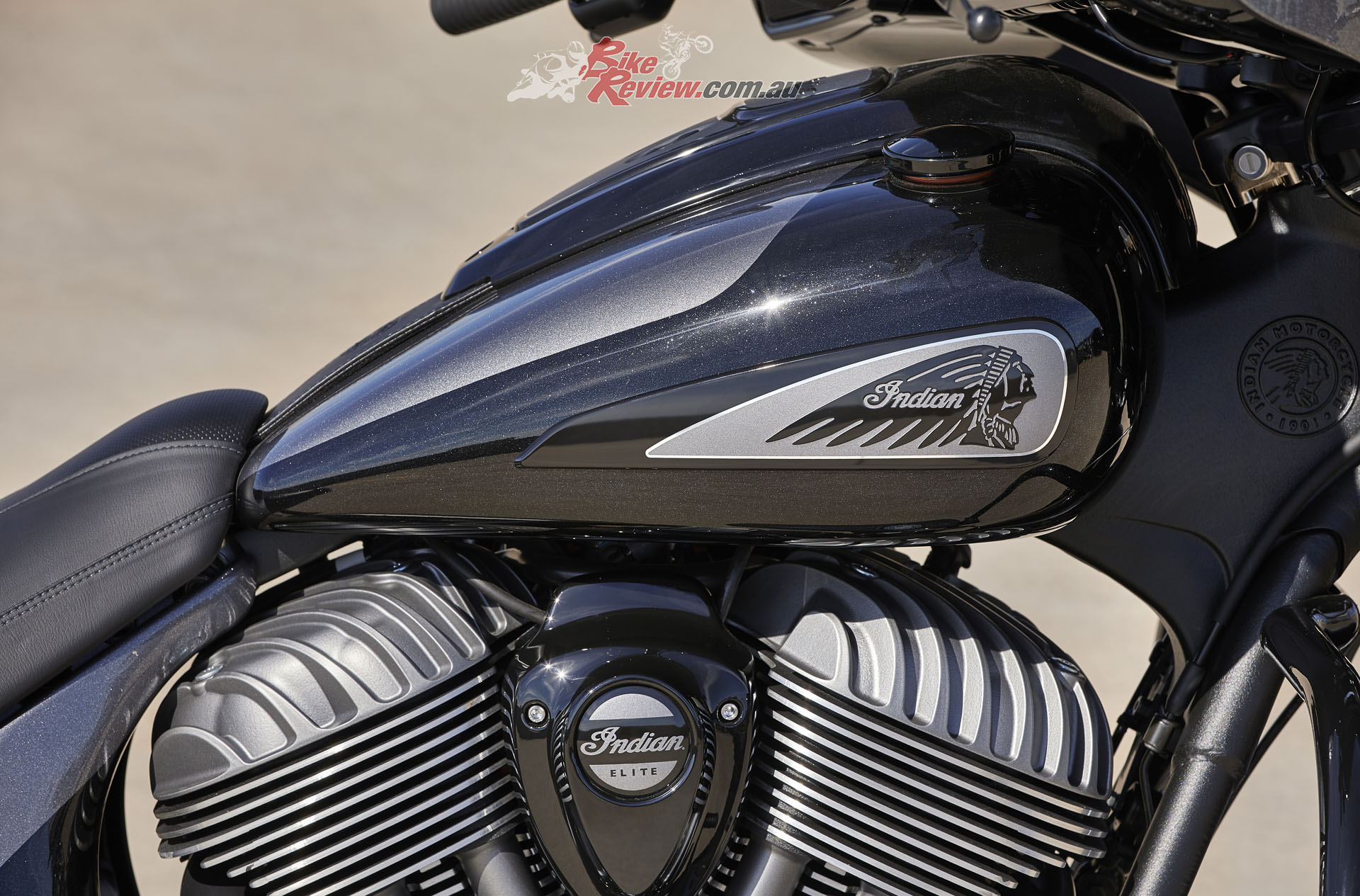 Indian say each Chieftain Elite undergoes a meticulous paint process that takes more than 24 hours to complete by hand. From the gunmetal flake layered within the paint to the Slate Smoke engine finishes this premium bagger has a custom feel with utmost attention to detail. The Chieftain Elite’s streamlined fairing and slammed saddlebags with sharp lines and hard edges give the bike a commanding presence, while the two-up Rogue seat delivers a sleek profile.
