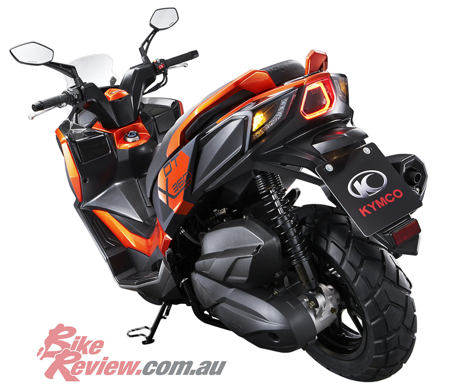 The KYMCO DT X360 features the upright proportions and front mudguard that characterise the styling of a dual-sport motorcycle. The “adventure maxi-crossover” also has a wider handlebar that KYMCO claim gives easier steering on uneven surfaces and a higher (800mm) seating position to improve rider visibility. KYMCO also say the lightweight wheels and adventure-oriented tyres further enhance its capability to conquer rough surfaces.