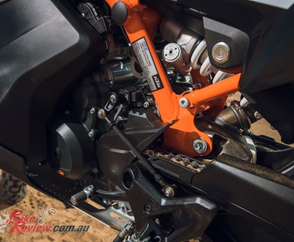 This increases torque slightly below 7500rpm, and reduces it from there to the 10,000rpm limit. Maximum power output drops by 10bhp to 94bhp at 8000rpm, while the torque peak is slightly higher at 89N.m, and is produced 1400rpm earlier, at 6600rpm. The Adventures’ shared chrome-molybdenum frame (orange in the case of the R) holds a cast aluminium swing-arm, which operates the diagonally mounted rear shock without a linkage.