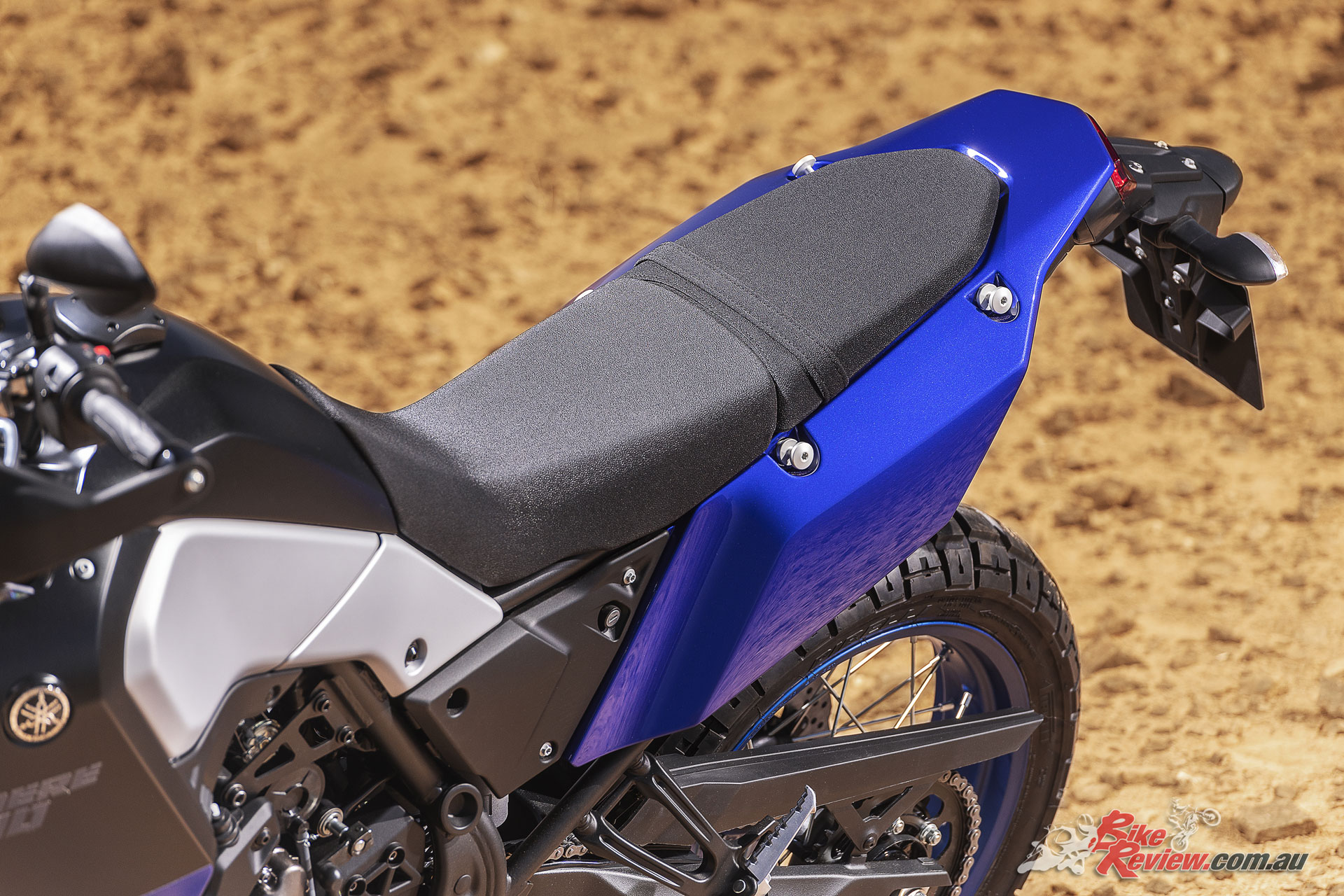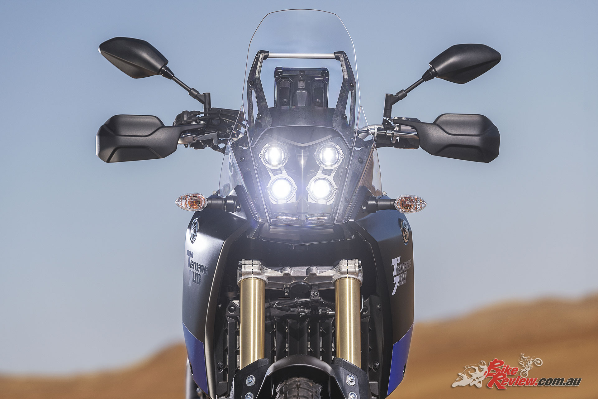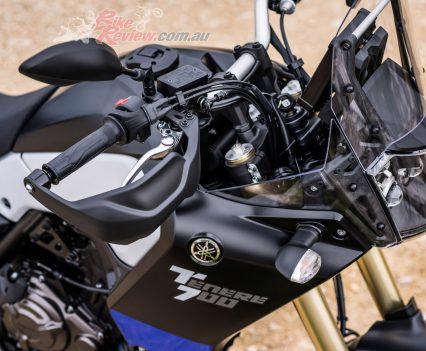 The Ténéré follows the T7’s desert-racer look, notably its tall front end with its Perspex screen shielding four LED lights, a high-level instrument panel and useful bar for attaching satnav or other accessories. The seat is quite tall, at 875mm (a lower accessory seat and shock linkage can reduce this to 840mm), but sufficiently slim that most riders will be able to get feet on the ground.
