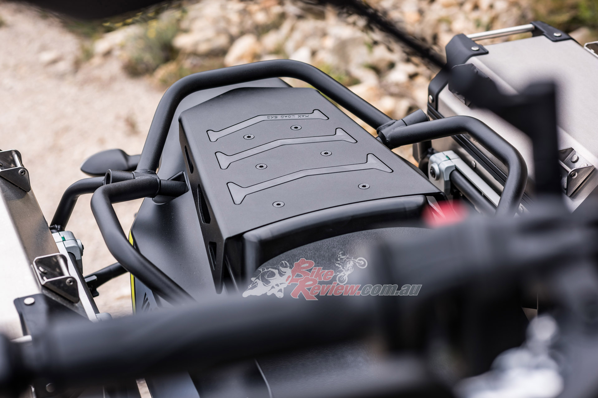 The seat has built-in luggage hooks and, less visibly but equally thoughtfully, hand-holds below to facilitate picking up the bike. The front mudguard is height-adjustable, to cope with mud. The sidestand has a helpfully broad foot. Footrests are serrated, have removable rubbers, and are hinged on forged aluminium hangers. Mirrors are usefully wide; switchgear is basic, and doesn’t include self-cancelling indicators, but has a button to toggle through a display that includes fuel consumption. A 12V socket is provided alongside, with space for a second.