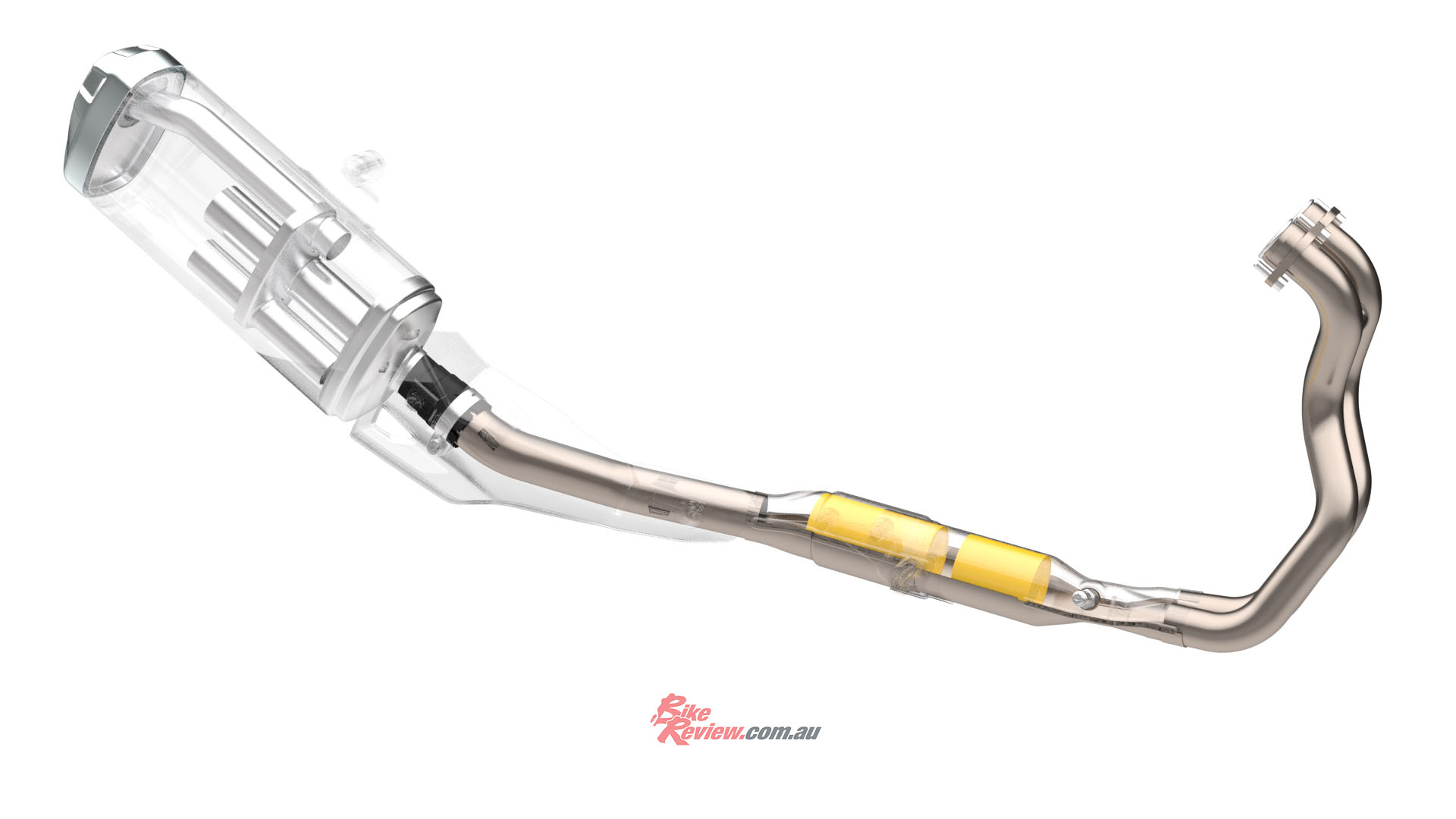 - The 2-into-1 exhaust system features a dual-stage catalytic converter inside the collector that helps satisfy Euro 5 emissions standards, and a long, upswept muffler.