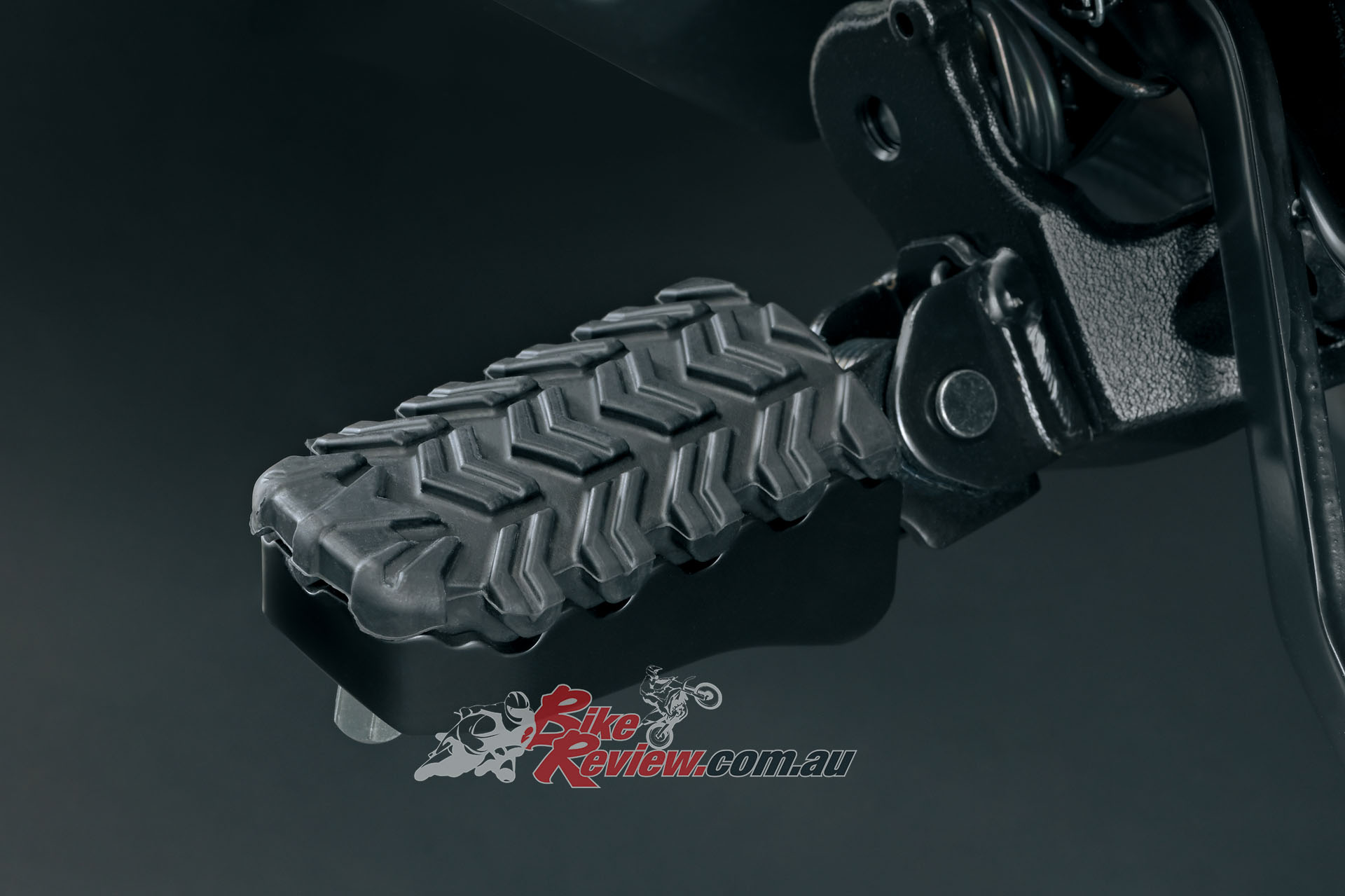 - Wide rubber-covered steel footpegs feature a textured surface that prevents slipping.