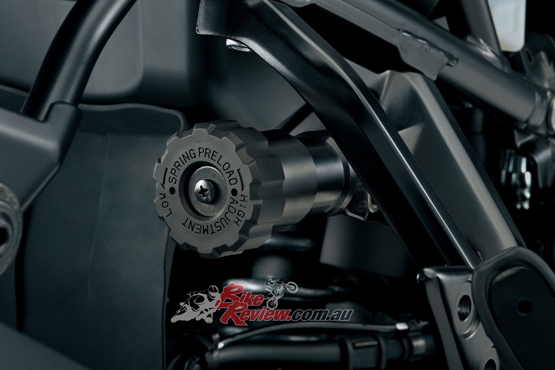 - Adjustable Hitachi Astemo (SHOWA) rear suspension with link, with its 220mm of travel contributes to agility and stability. The spring preload can be adjusted easily by hand, which is beneficial when preparing to ride tandem or carry a load.