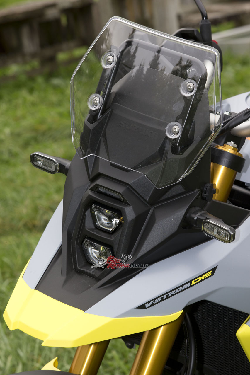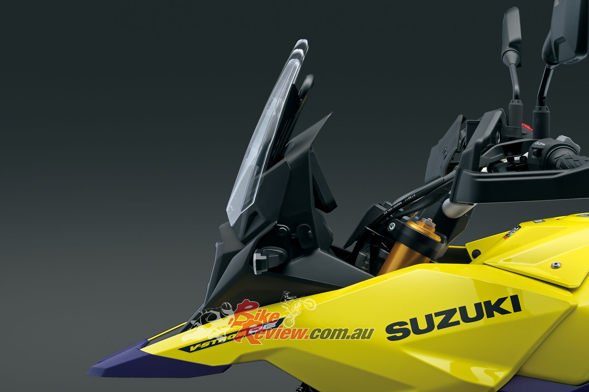 Suzuki has maintained the distinctive V-STROM ‘beak’ on the 800DE, but it’s now positioned higher which they say is to convey the model’s exceptional ability to handle gravel roads and tough trails. The short – but three-way adjustable – windscreen is designed to maximise visibility off-road, as well as protecting the rider from buffeting at higher speeds.