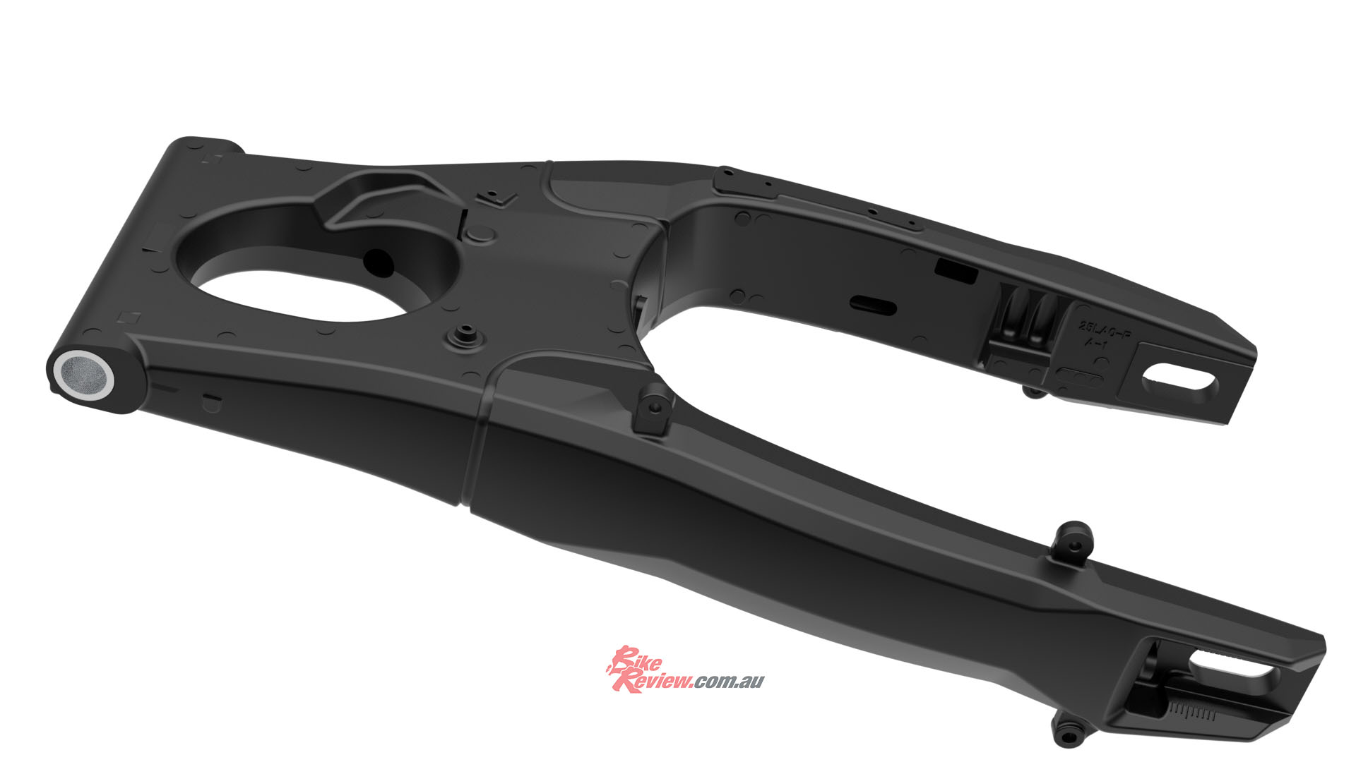 - Adopts a uniquely shaped lightweight aluminium swingarm with enhanced torsional rigidity to support the increased suspension travel and contribute to straight-line stability.
