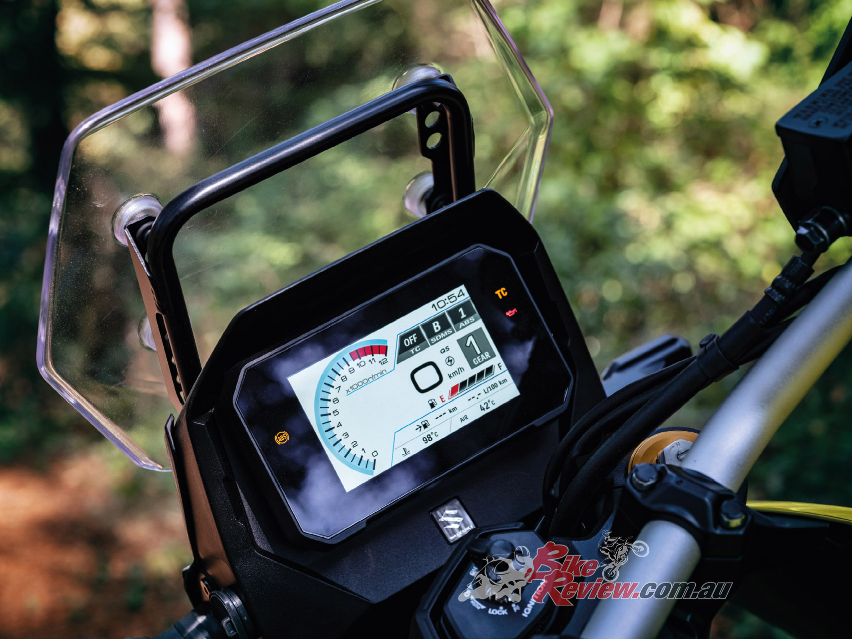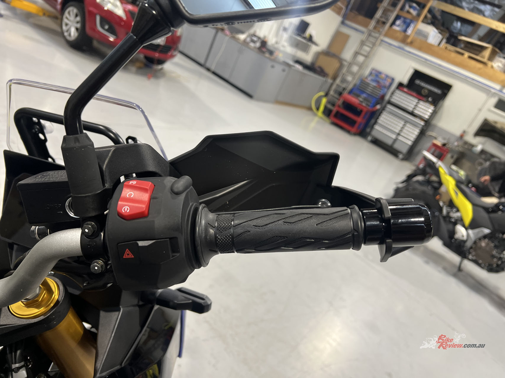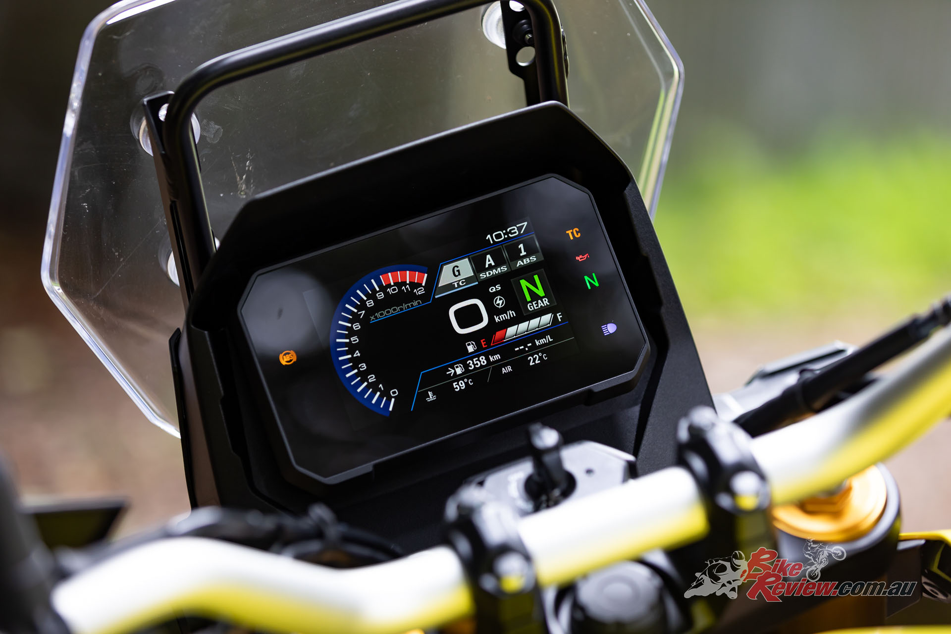 The 5in TFT is the exact same to the one on the 1050DE. The super clear and ultra colourful display is simple to use, just click through the modes you want with the buttons on the left hand side of the ‘bars and you’re in business. The screen is angled well so you can see it clearly standing up or sitting down, however a vertical stacked one is more suited to adventure riding.