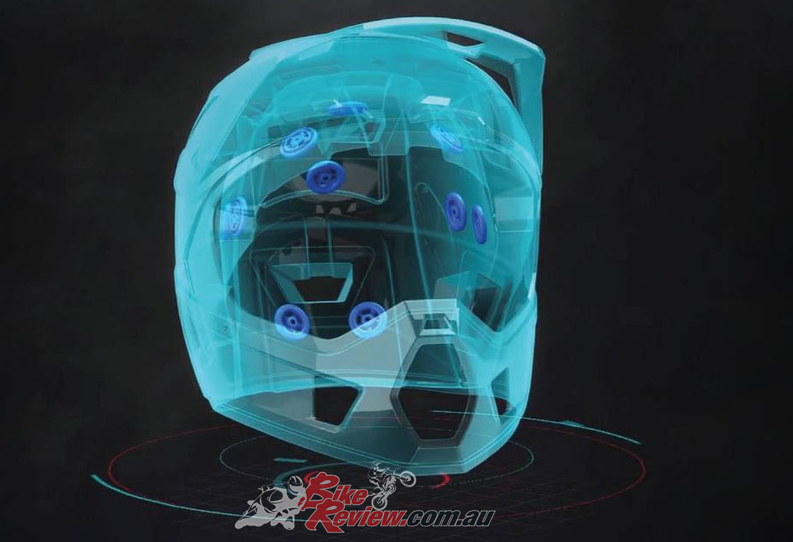 Disc-shaped turbines made of Armourgel, a non-Newtonian polymer that can absorb energy, are strategically placed all along the inside of the helmet’s EPS liner. So, when you put the helmet on, they are positioned directly against the skull.