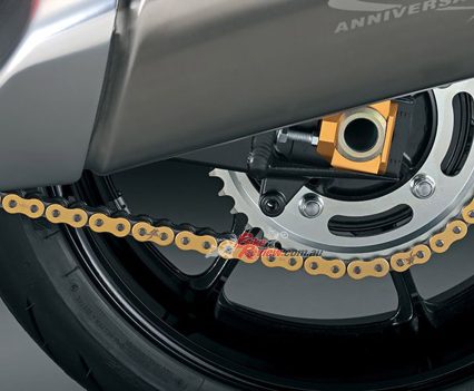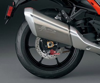 The special features for the 25th anniversary model are an orange and black-based body, and special colours for the drive chain adjuster and front brake disk inner. Original engravings have been added to the muffler body and drive chain, and a 25th anniversary emblem and a three-dimensional “SUZUKI” logo on the tank. Also, the single-seat cowl is standard equipment (excluding Japan spec).