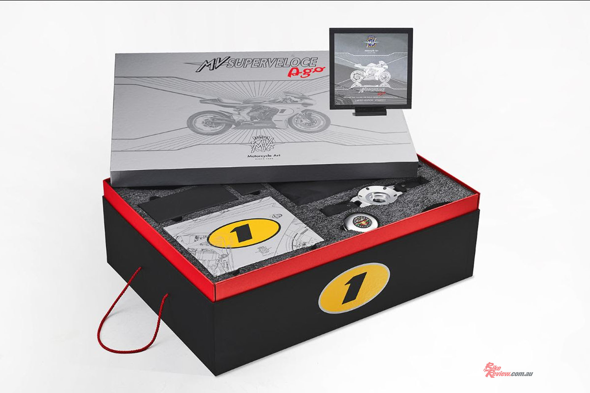 One of the many details that make the MV Agusta Superveloce Ago kit unique are a pair of icon red handle grips, just like the ones used by Agostini, and the carbon fibre seat cowl fitted with an Alcantara pad. An exclusive bike cover as well as a certificate guaranteeing the authenticity of the limited series is also included.