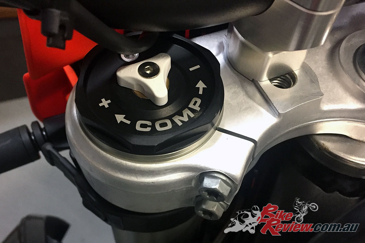 These included adjusting the gear lever up one notch, and adjusting the suspension. The rear end was too soft, with not enough rebound, so I added two clicks compression and two clicks rebound, which just needed the flat blade screwdriver in the toolkit. On the front end, which was a little hard, I took off one click of compression, which can be adjusted by hand. I also had to straighten out a slight bend in the gear lever when I got home.