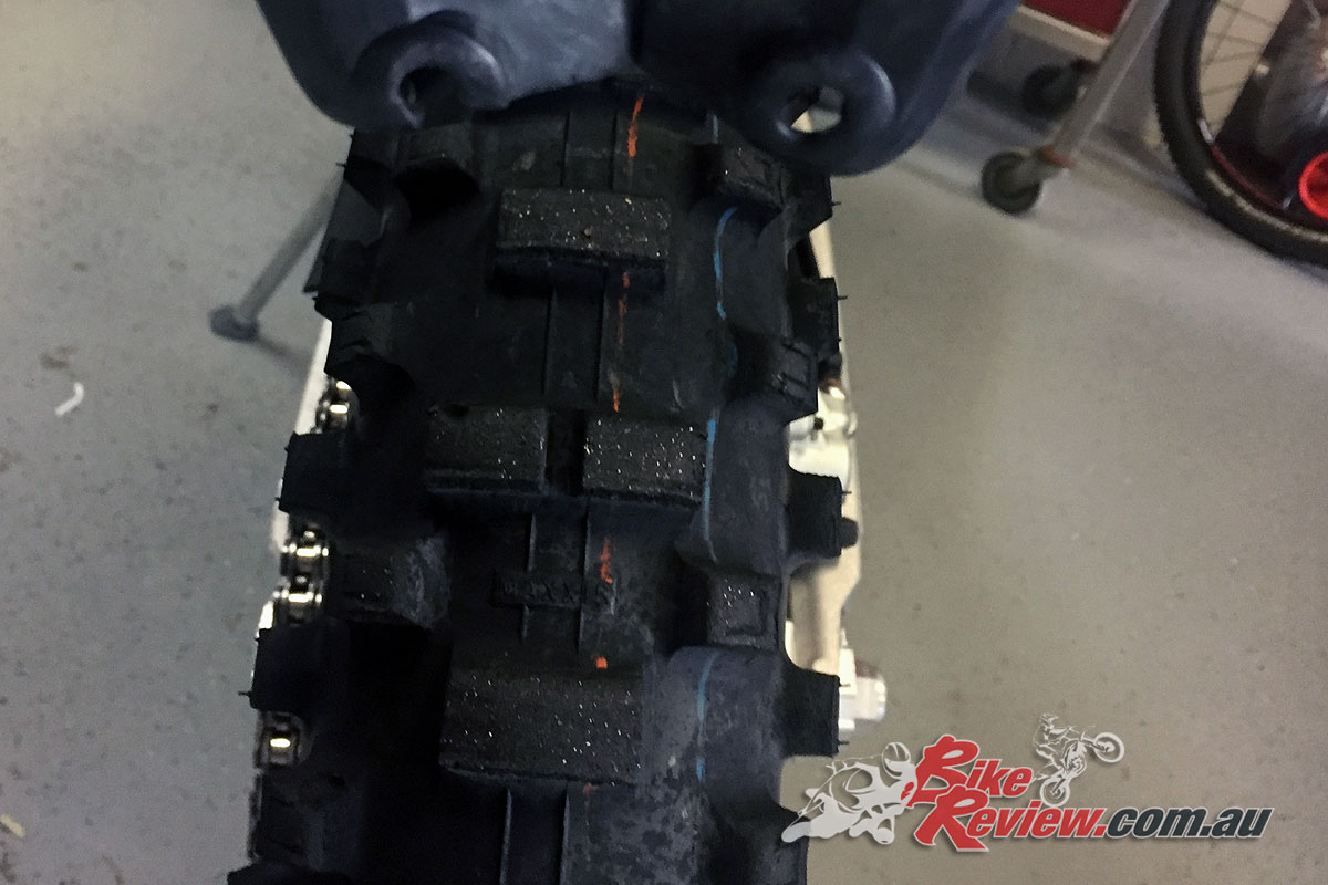 Mousse tubes are essentially an inner tube replacement with a honeycomb structure that ensures punctures aren’t a concern – particularly important when you’re out having fun and don’t want to get stranded or spend ages replacing a tube. However, KTM don’t want us to fit them, leaving us open to punctures. While on this point, on dirt both combos work well, however after 225 kilometres the rear Maxxis is already looking tired.