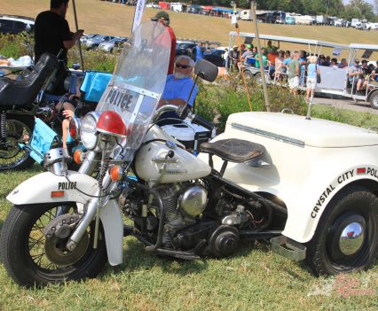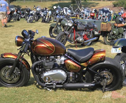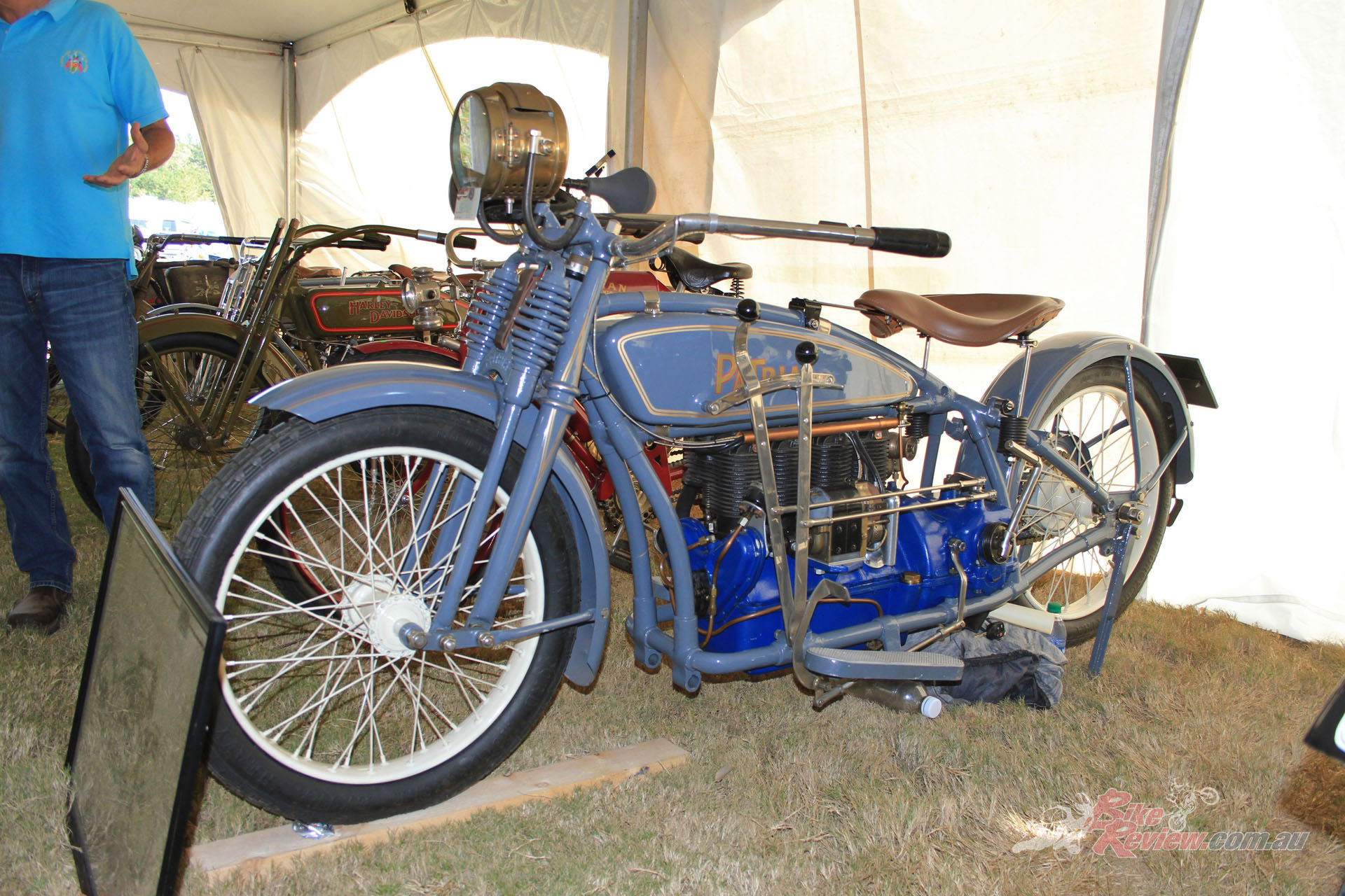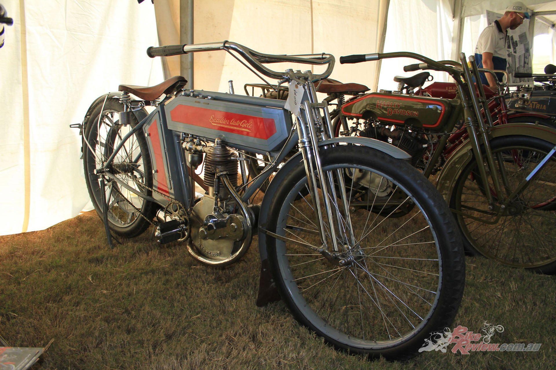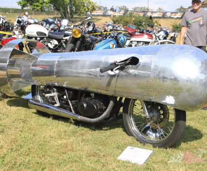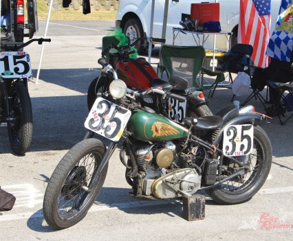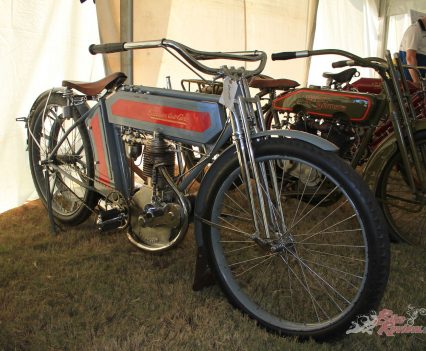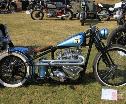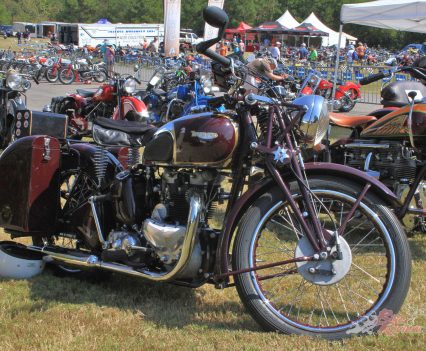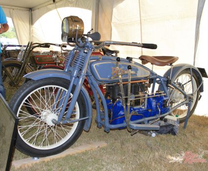 Inside the AMCA marquee was a stunning example of an Excelsior single, parked beside a V-twin from the same manufacturer, an immaculate Model F Harley, and an inline four Patria of 1263cc capacity. Some real rarities on show there, many of which had been used in the infamous Motorcycle Cannonball run for veteran machinery that has been running, coast-to-coast across America, every other year over the last decade.