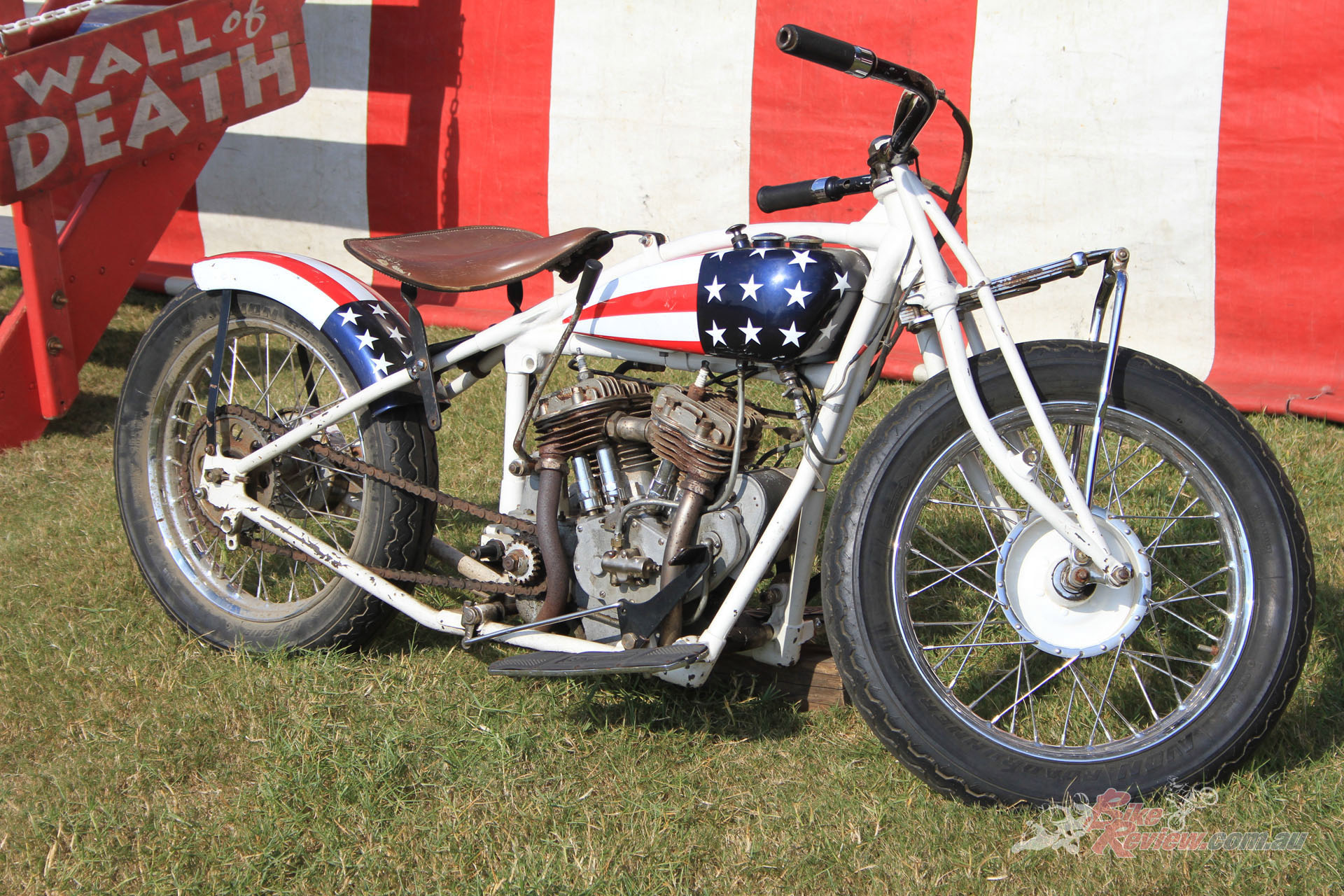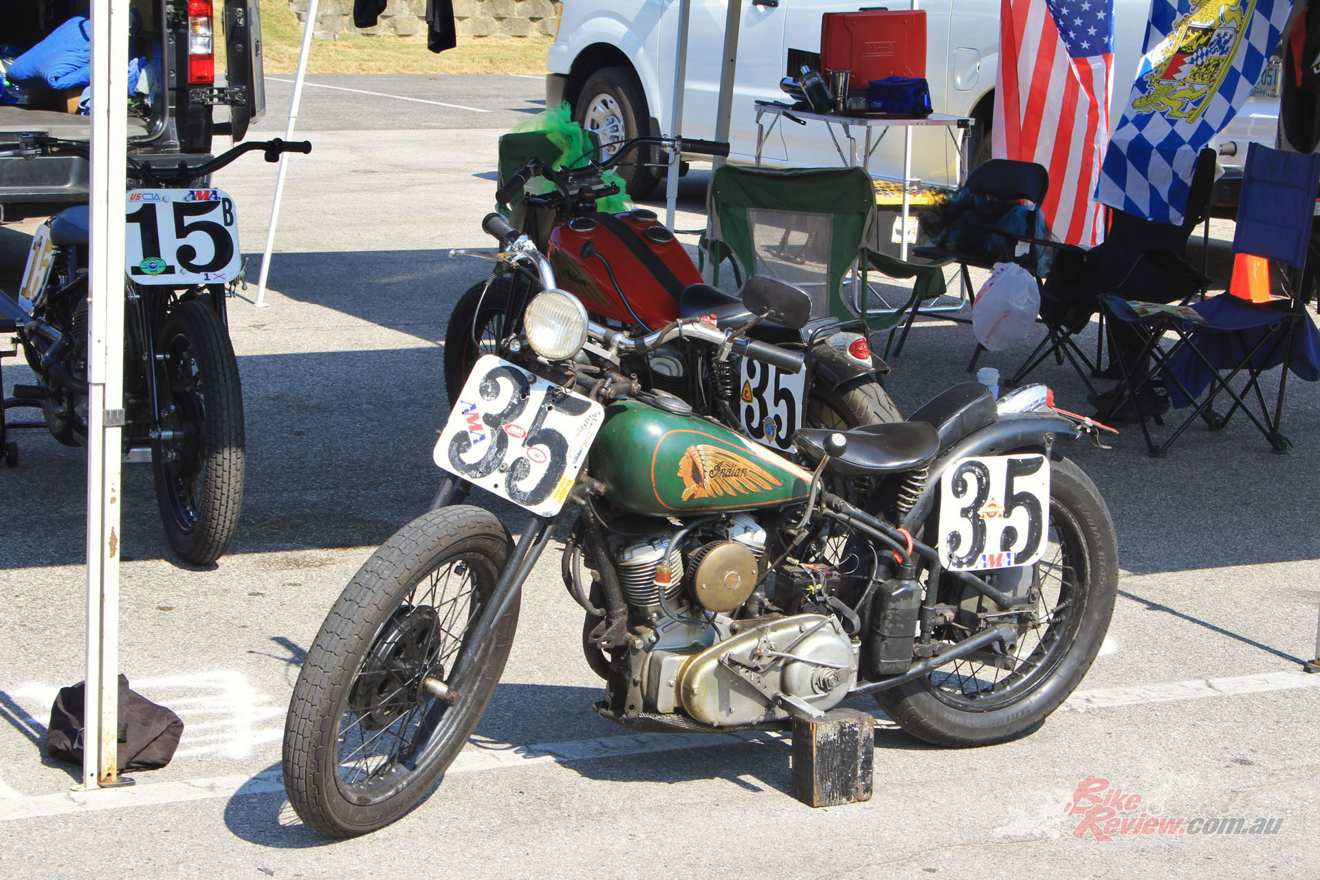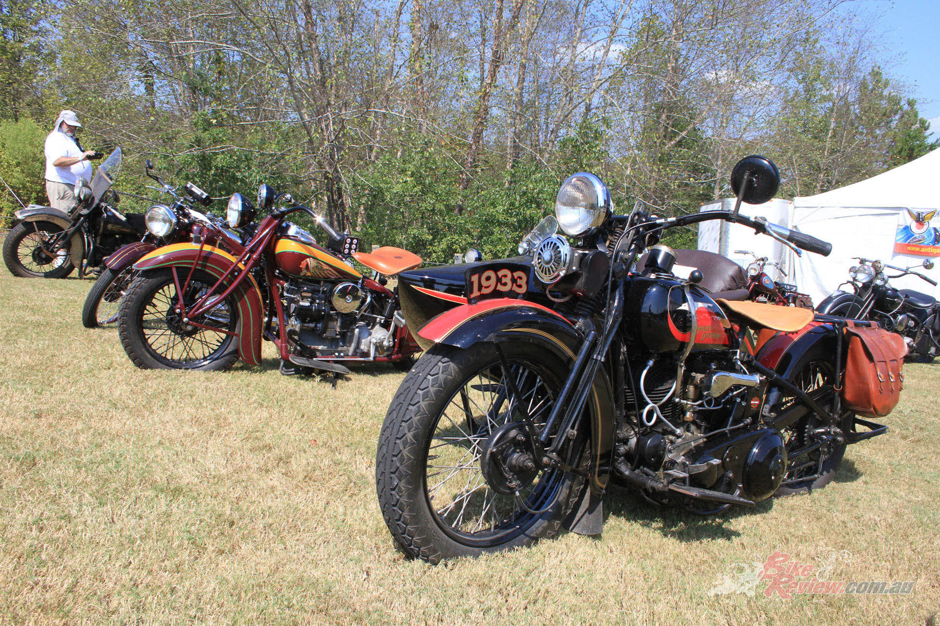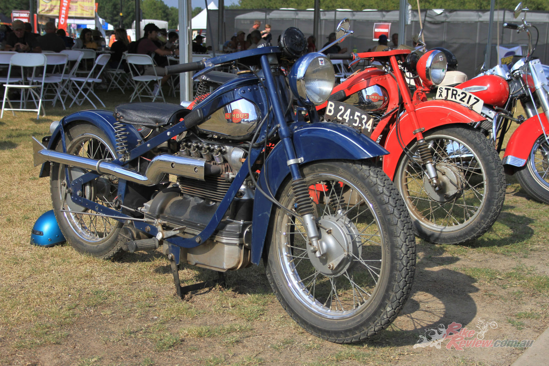Inside the AMCA marquee was a stunning example of an Excelsior single, parked beside a V-twin from the same manufacturer, an immaculate Model F Harley, and an inline four Patria of 1263cc capacity. Some real rarities on show there, many of which had been used in the infamous Motorcycle Cannonball run for veteran machinery that has been running, coast-to-coast across America, every other year over the last decade.