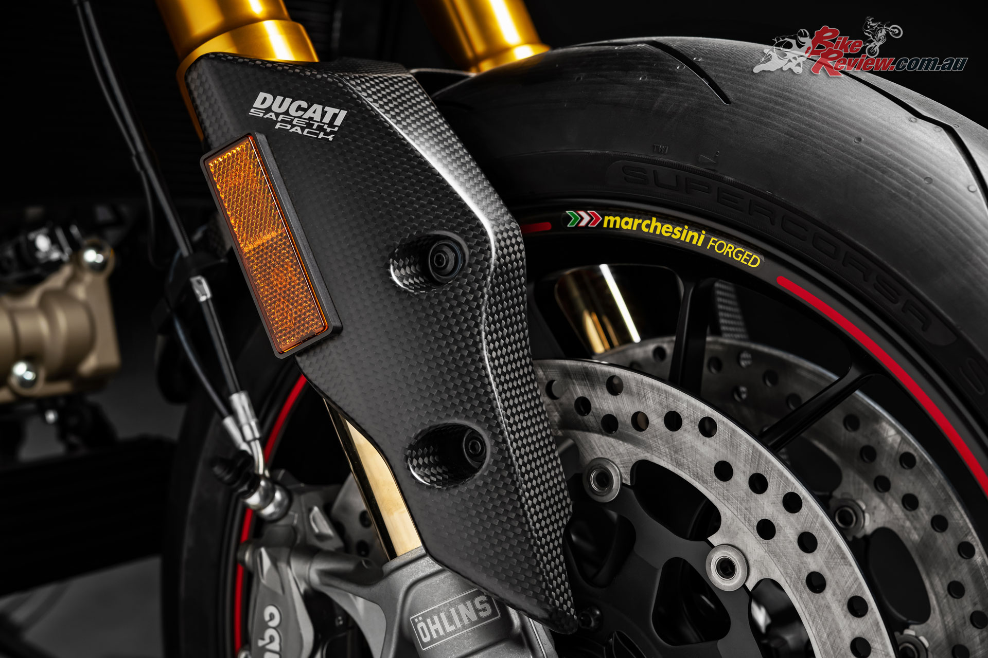 - Carbon fibre components: front mudguard, belt covers