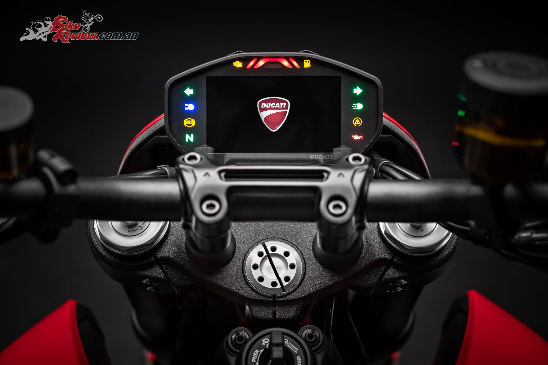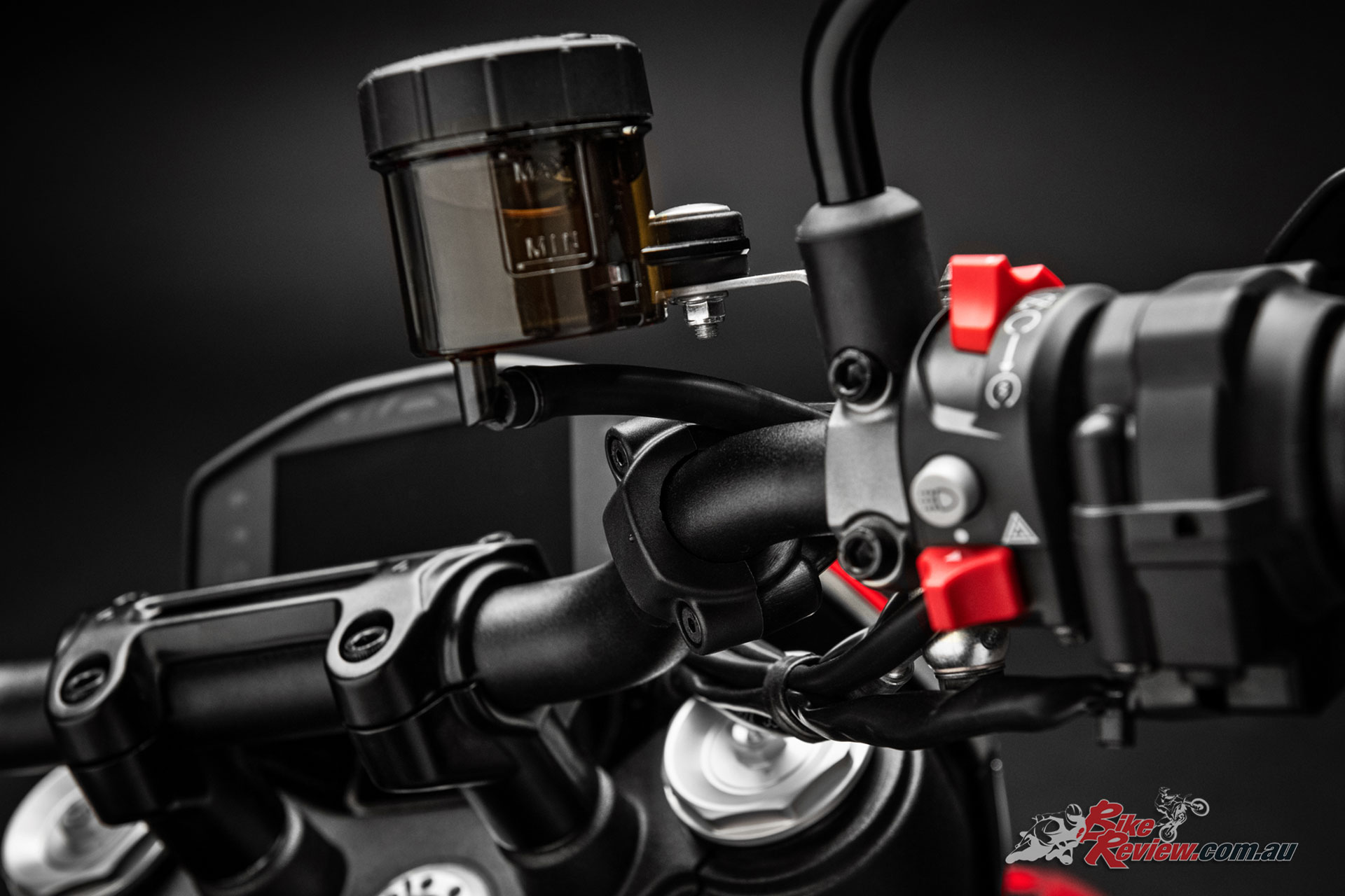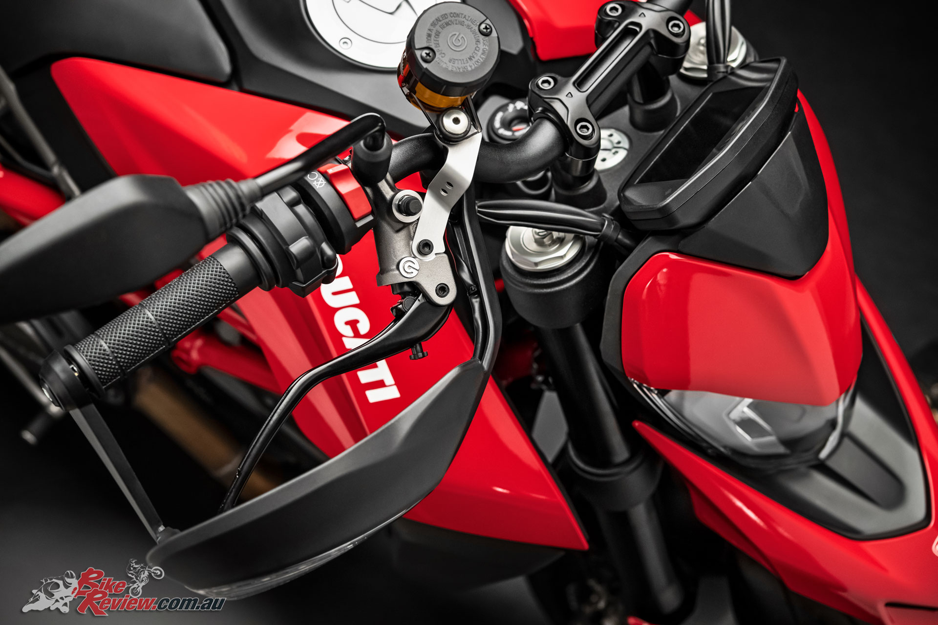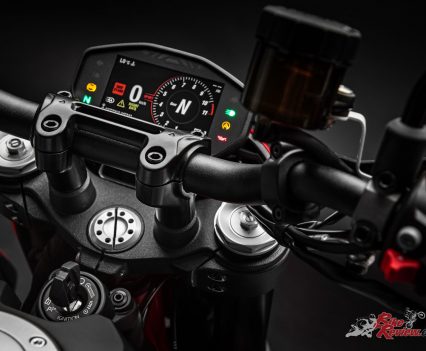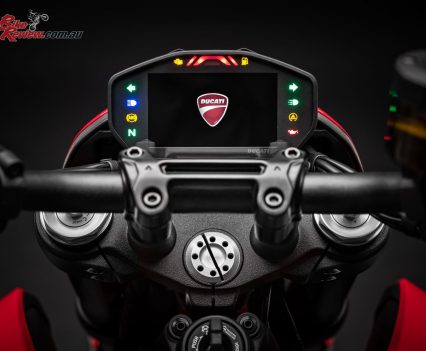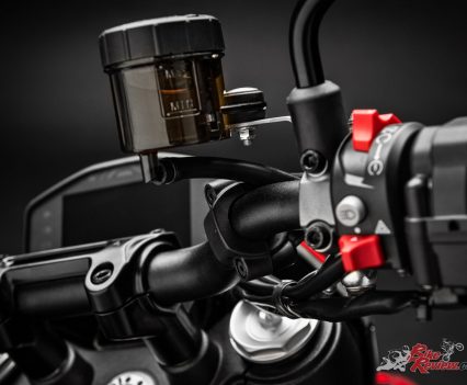 The tapered aluminium handlebars mount radial pumps with separate front brake and clutch fluid reservoirs (a hydraulic clutch replaces the previous cable-operated one); the design and interface of the colour TFT display take their cue from the panel on the Panigale V4.