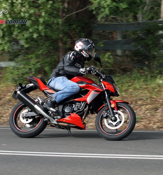 Front wheel width is 3.5inch with a 120/70ZR17 tyre, the rear 4.5inch with a 160/60ZR17 tyre. A single front 320mm wavy disc and two-piston brake caliper is matched to a 240mm rear disc and single-piston caliper. ABS is fitted as standard.