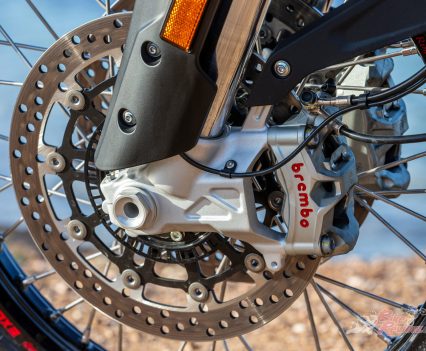 Braking power is provided by Brembo Stylema monobloc calipers and finessed by changeable electronic engine brake strategies, both of which you’d normally associate with a high-end superbike. The on-paper weight of the Enduro Veloce suggests the stoppers are in for a tough challenge, but in reality offer copious power and feel, along with cornering ABS just in case.