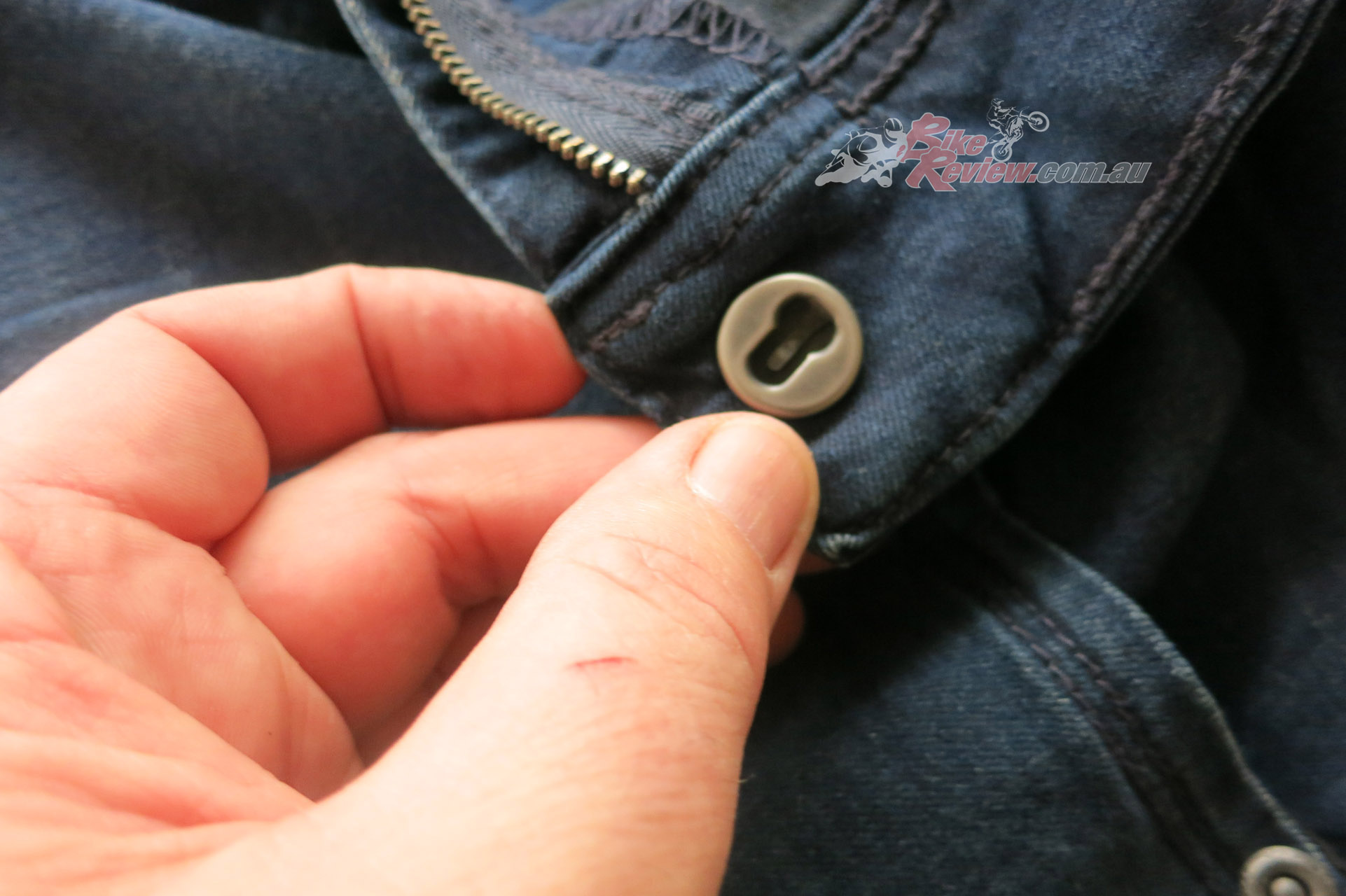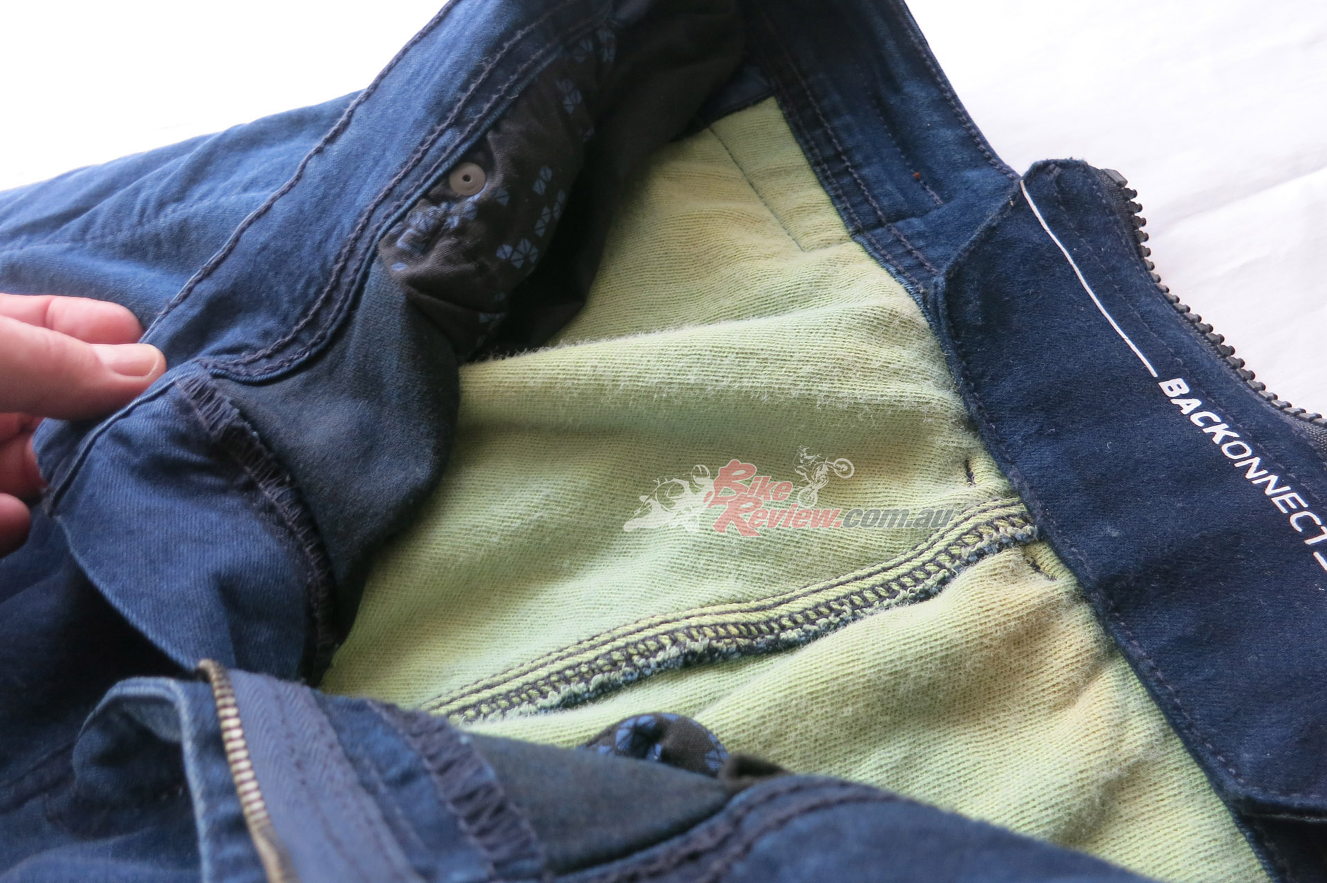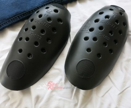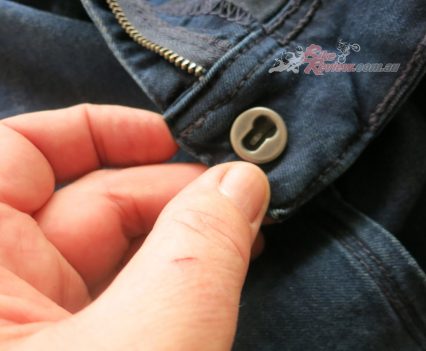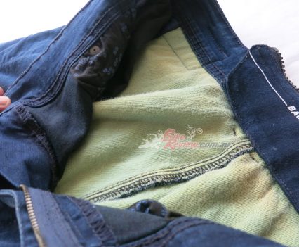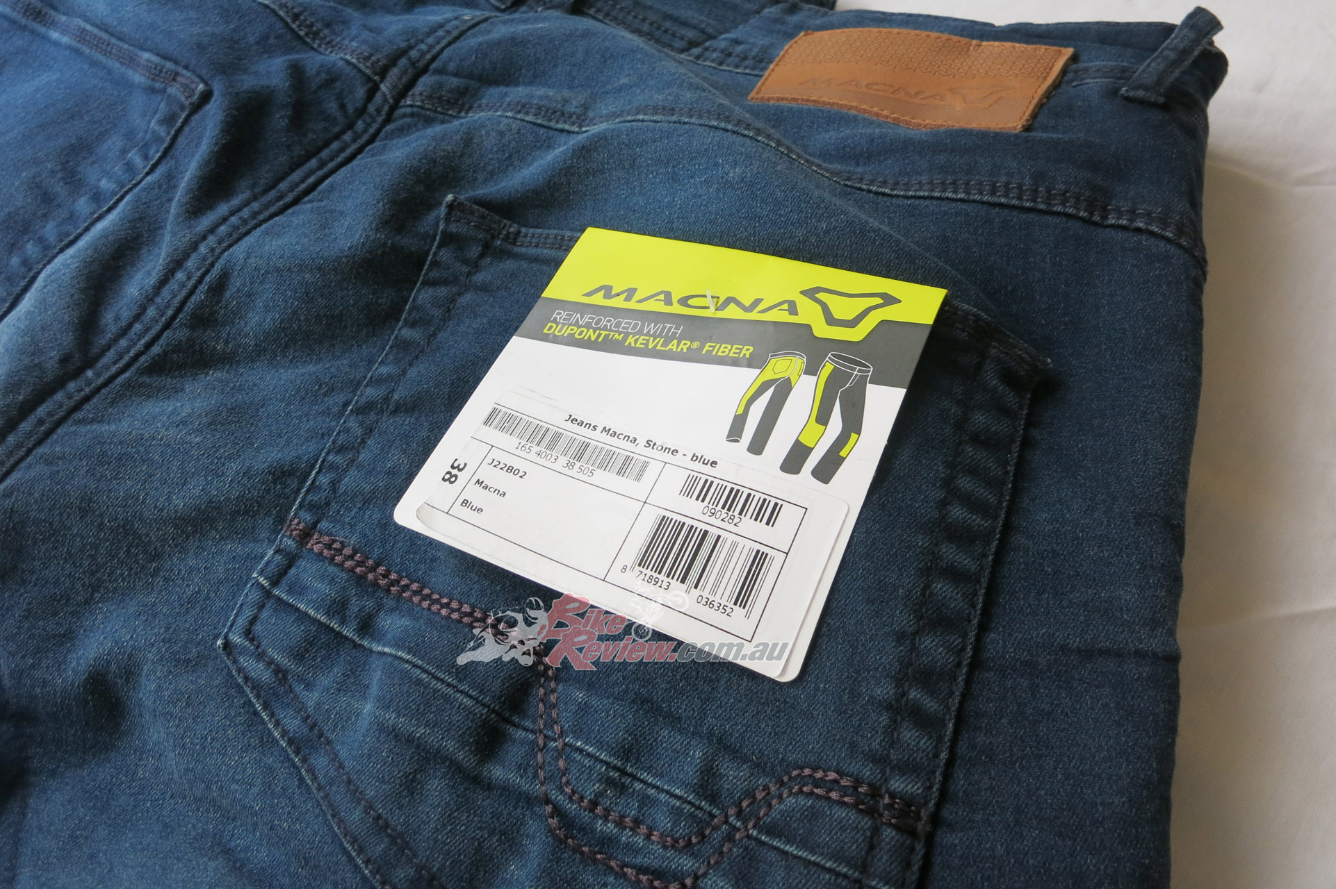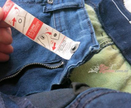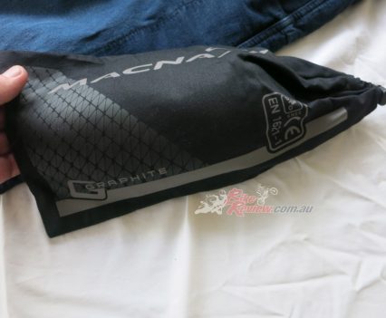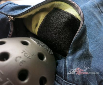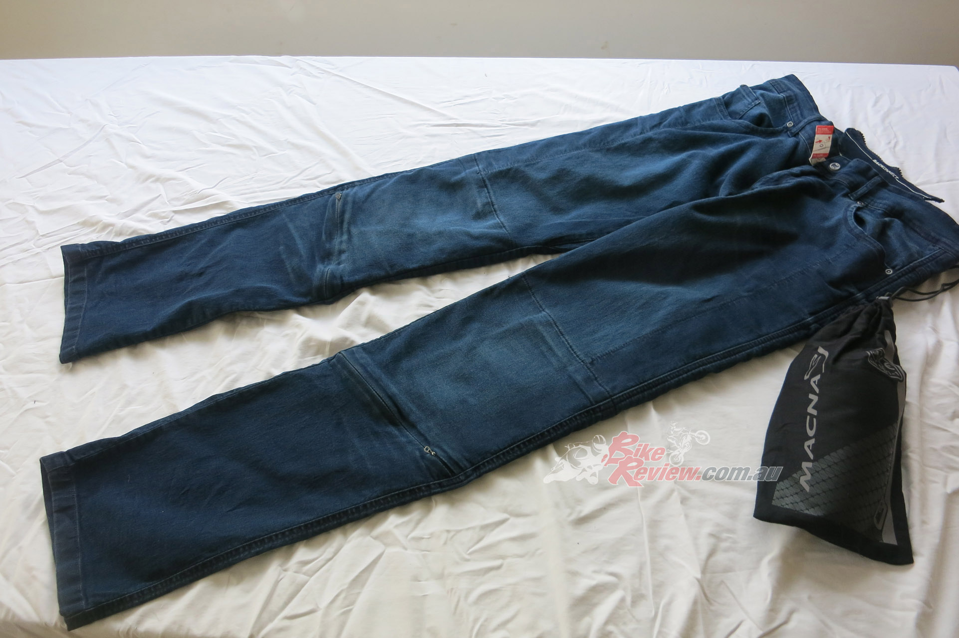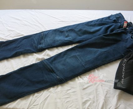 The Macna Stone jeans cost $299.95 RRP and feature stretch panels around the backside and knees for comfort, CE removable knee armour, CE hip preparation, jacket connector that velcro attaches to pants, aramid reinforcement at hips, knees and backside. Jeff is using these as is John Arens.