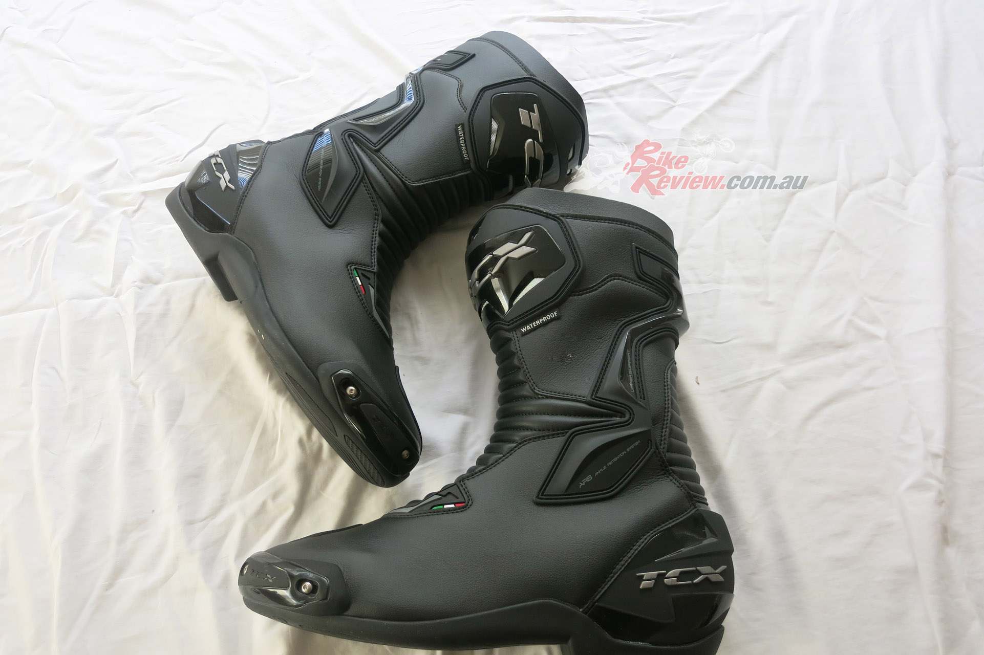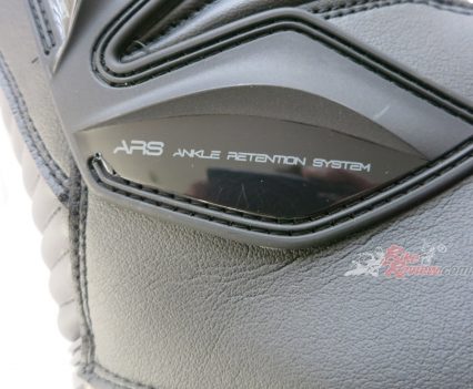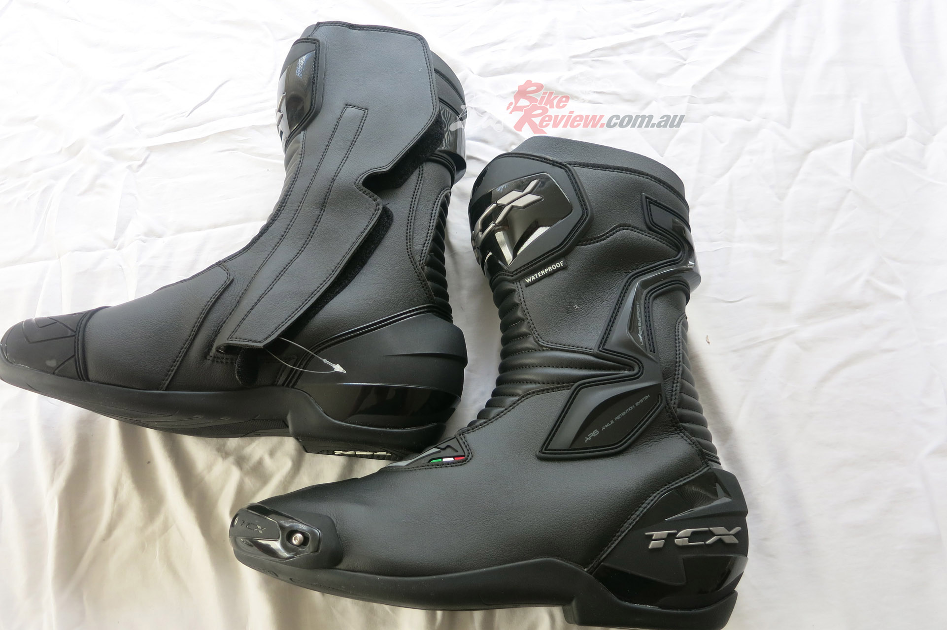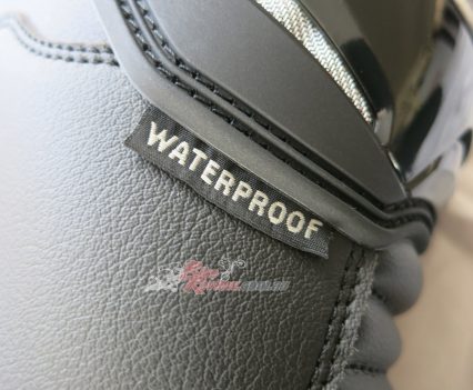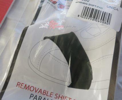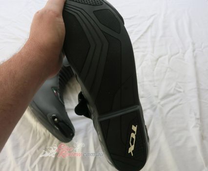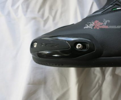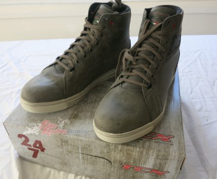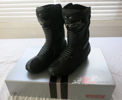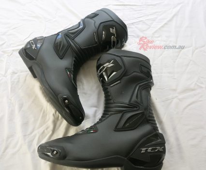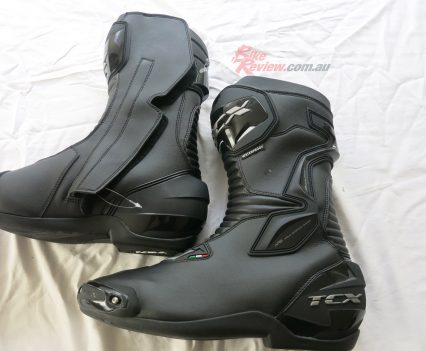 TCX SP Waterproof road boots $349 RRP are a street and track day sports touring style boot with toe sliders for the sportsbike rider. They are a leather boot with zip and velcro fastener, with an oversize calf area velcro fastener for comfort. The toesliders are replaceable as is the mid sole and the boots are waterproof. They also feature a shift pad and armour protection in the ankle, heel and shin area. They are a comfy, easy to put on boot for everyday use as well as sports riding. Jeff has been wearing them and will put up a full review soon.