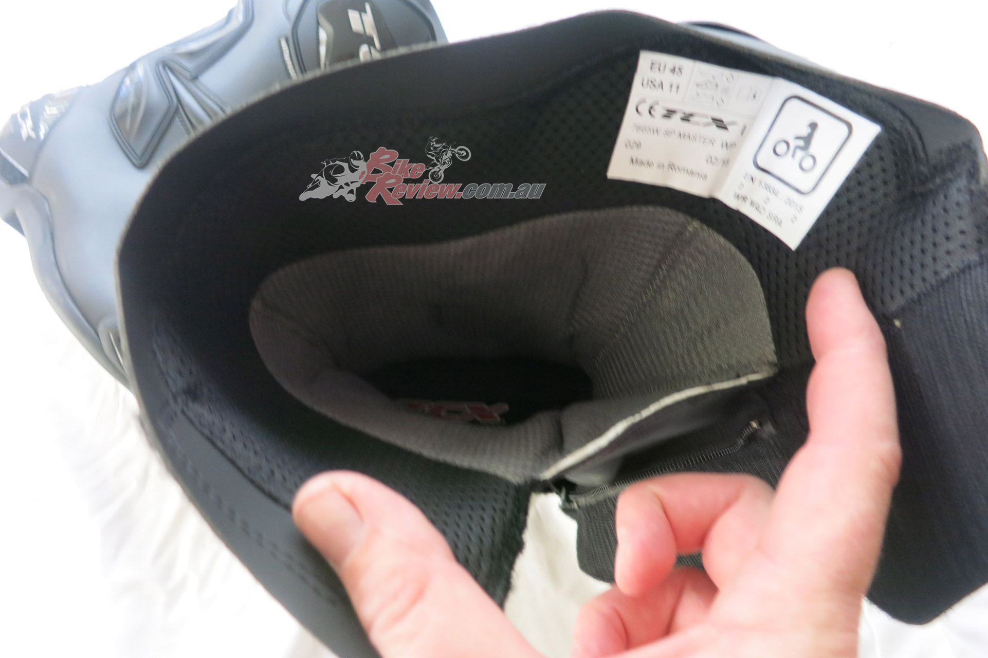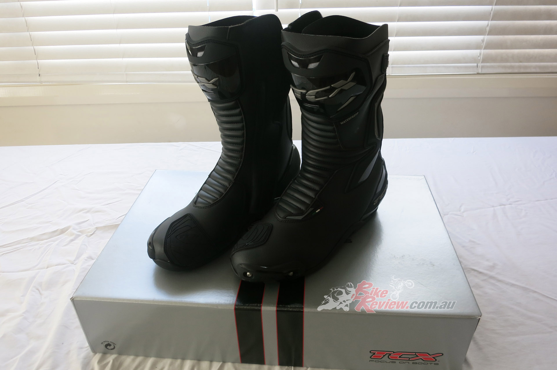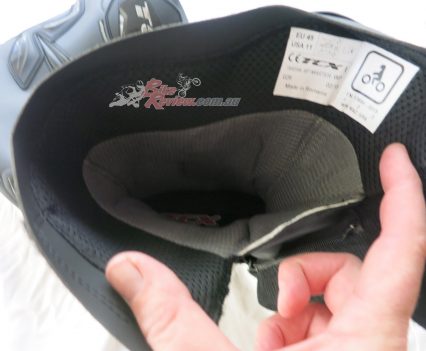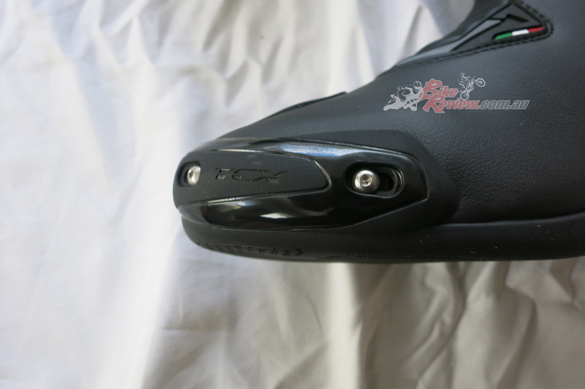 TCX SP Waterproof road boots $349 RRP are a street and track day sports touring style boot with toe sliders for the sportsbike rider. They are a leather boot with zip and velcro fastener, with an oversize calf area velcro fastener for comfort. The toesliders are replaceable as is the mid sole and the boots are waterproof. They also feature a shift pad and armour protection in the ankle, heel and shin area. They are a comfy, easy to put on boot for everyday use as well as sports riding. Jeff has been wearing them and will put up a full review soon.