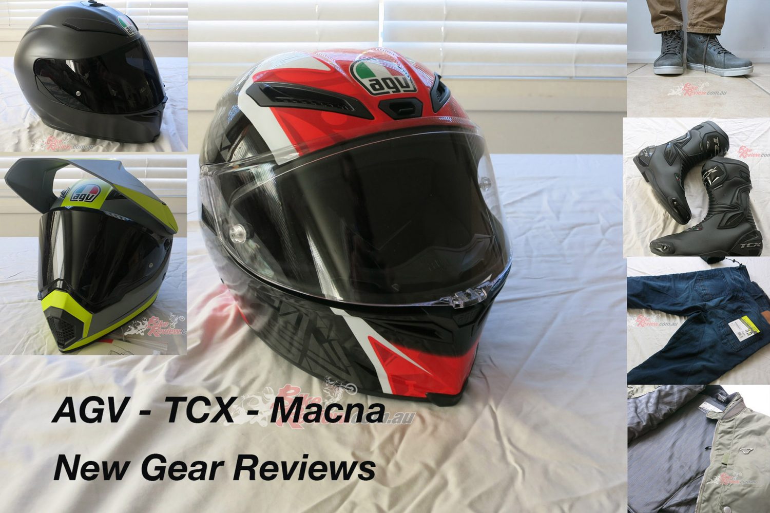 In for review for Jeff is a new top of the line track lid, the AGV Corsa R – Casanova, a pair of TXC Street Ace waterproof riding shoes, TCX SP waterproof road boots, a pair of Macna Stone Jeans and a neat Macna Bastic Green bomber jacket.