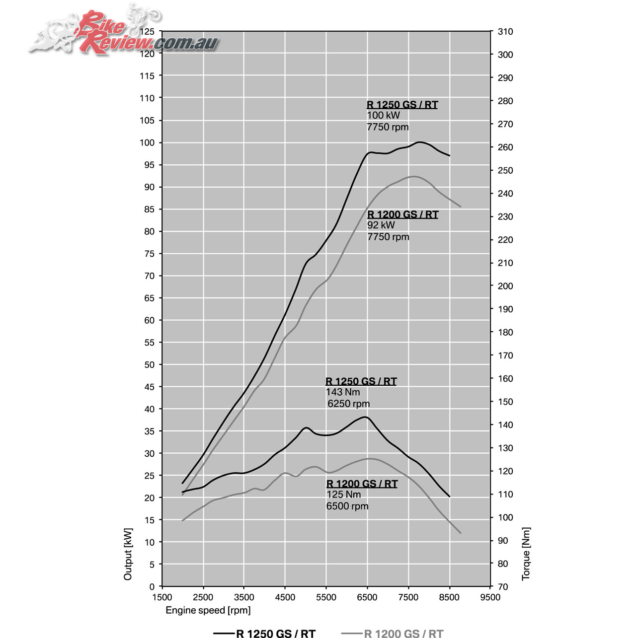 Engine: Air/liquid-cooled two-cylinder four-stroke boxer, 1254cc, 12.5:1 compression ratio, 102.5 x 76mm bore x stroke, four-valves per cylinder, two overhead spur gear driven camshafts, counterbalance shaft, variable intake camshaft control system BMW ShiftCam