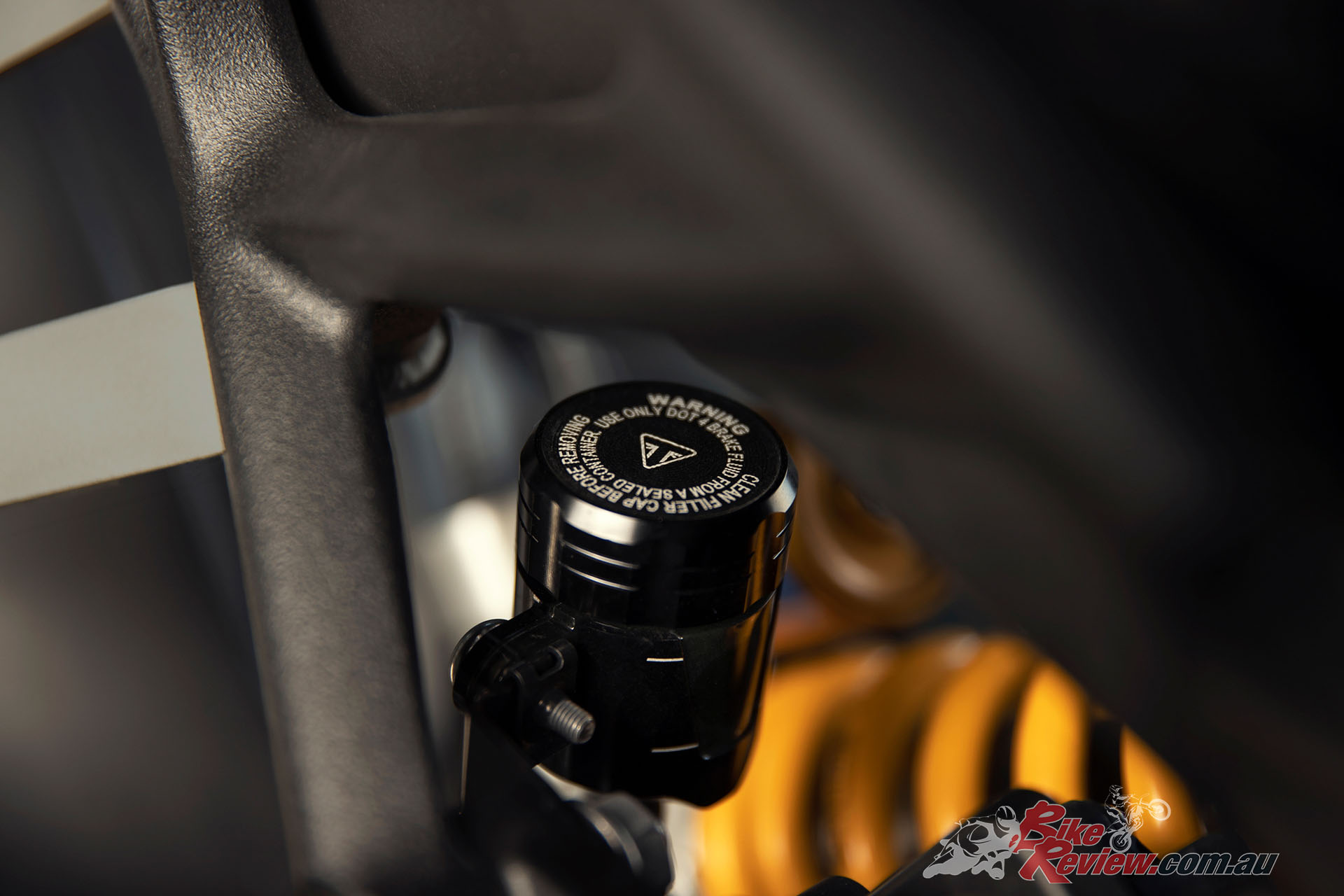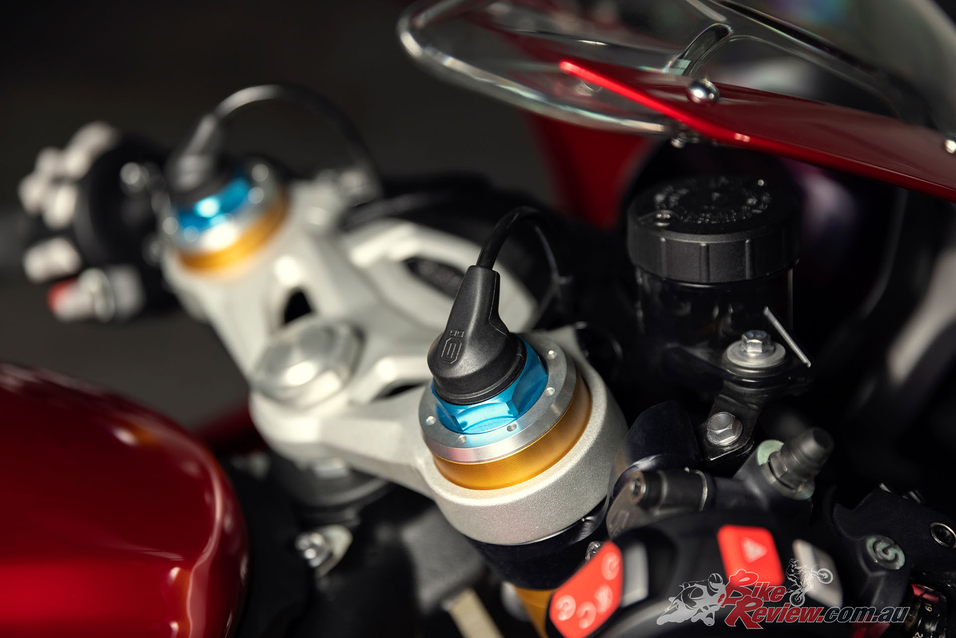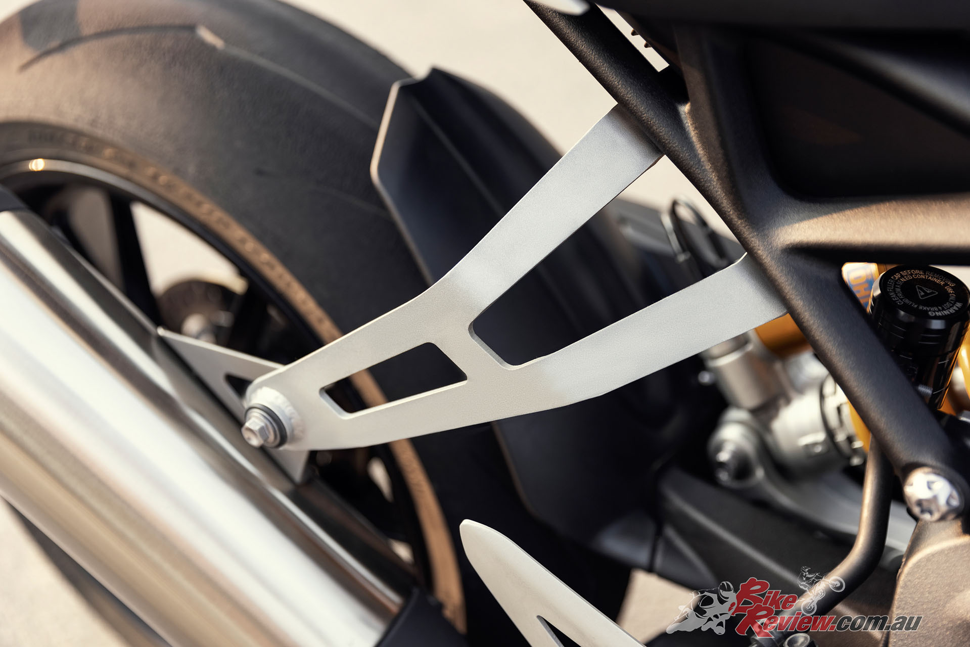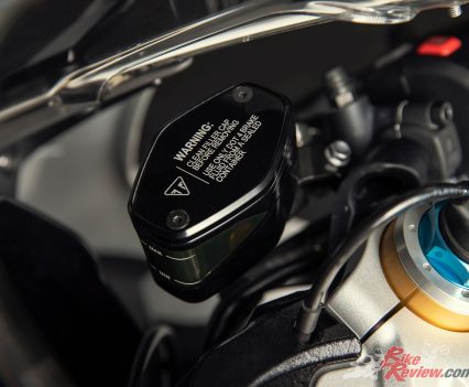 Brakes: Front – Twin 320mm floating discs. Brembo Stylema monobloc calipers, OC-ABS, radial master cylinder with separate reservoir, span & ratio adjustable. Rear – Single 220mm disc. Brembo twin piston caliper, OC-ABS. Rear master cylinder with separate reservoir.