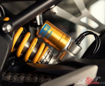 Suspension: Front – Öhlins 43mm fully adjustable USD forks, 120mm travel. Öhlins S-EC 2.0 OBTi system electronic compression / rebound damping. Rear – Öhlins monoshock RSU with linkage, 120mm rear wheel travel. Öhlins S-EC 2.0 OBTi system electronic compression / rebound damping.