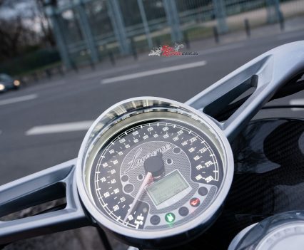Engine: 997cc water-cooled DOHC 88° V-twin four-stroke with four valves per cylinder and composite chain/gear cam drive, 94 x 71.8mm bore x stroke, 11:1 comp, electronic fuel injection with Synerject ECU and 2x50mm Synerject throttle-bodies, each with a single injector, 6-speed gearbox, multiplate oil-bath clutch with hydraulic operation.