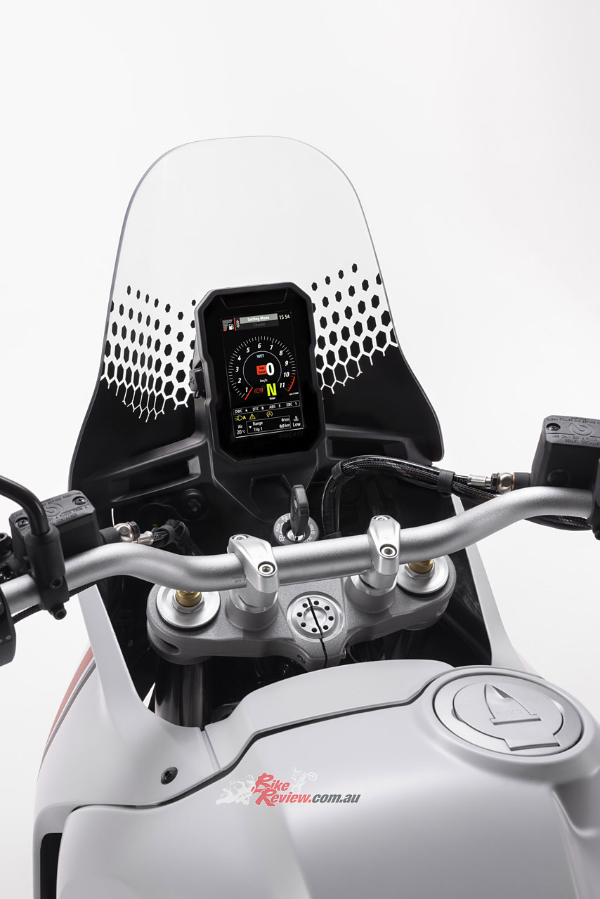 The dashboard of the DesertX, vertically oriented and positioned to offer clear information also in stand-up riding, features a high resolution 5” full-TFT colour display. The instrumentation integrates the Ducati Multimedia System which allows the rider to connect the phone, thus activating new functions such as music and incoming/outgoing calls or Turn-by-Turn navigation (optional), which displays directions directly on the dashboard.