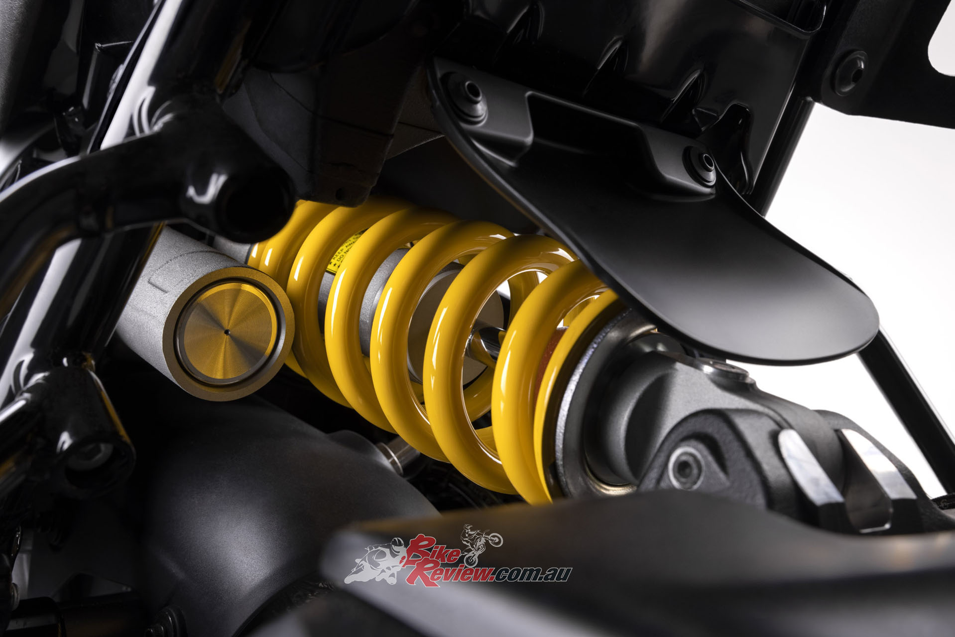 Suspension: KYB 46mm upside-down fork, fully adjustable (f), KYB monoshock, fully adjustable, remote preload adjustment, aluminium double-sided swingarm (r)