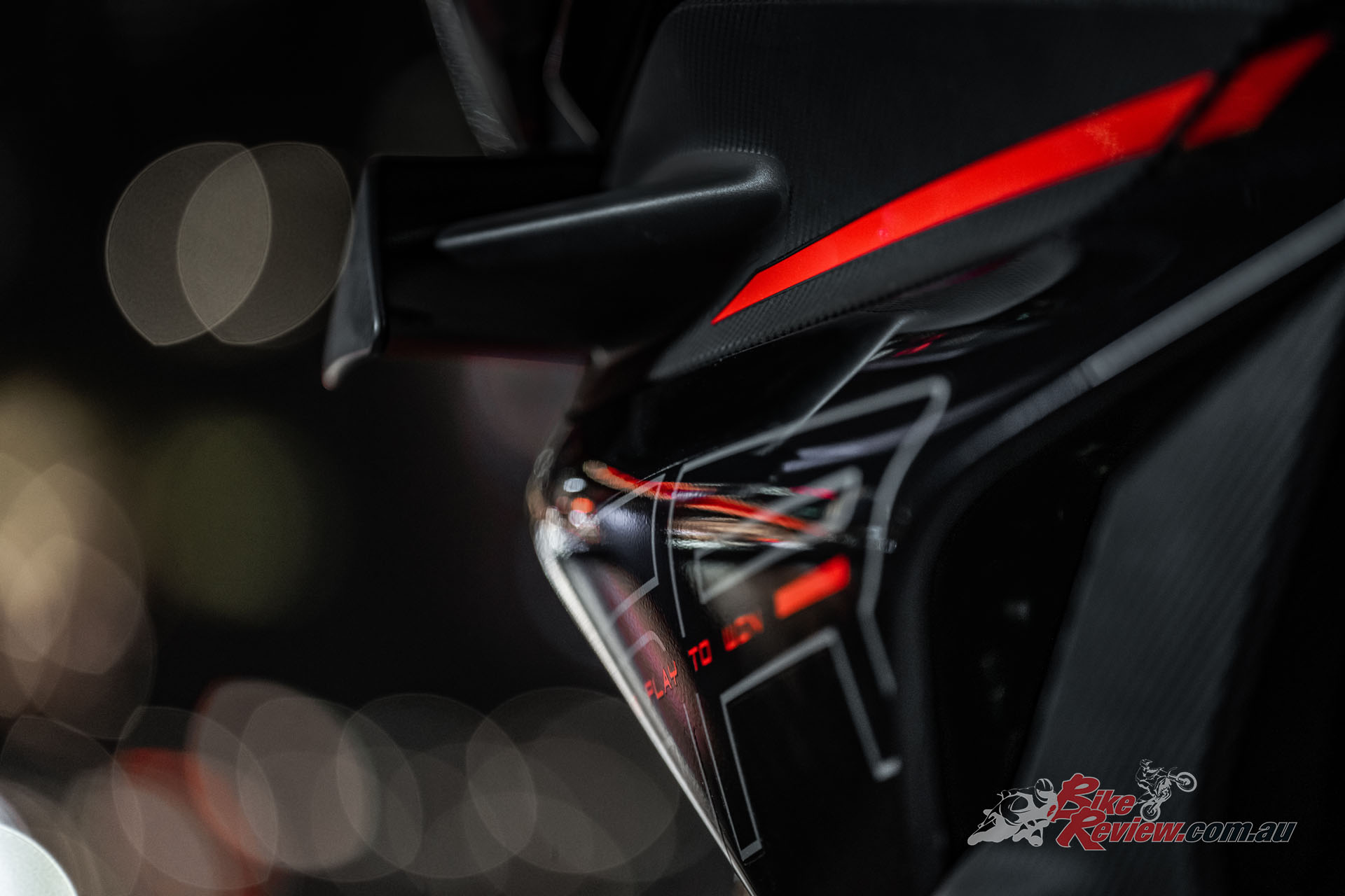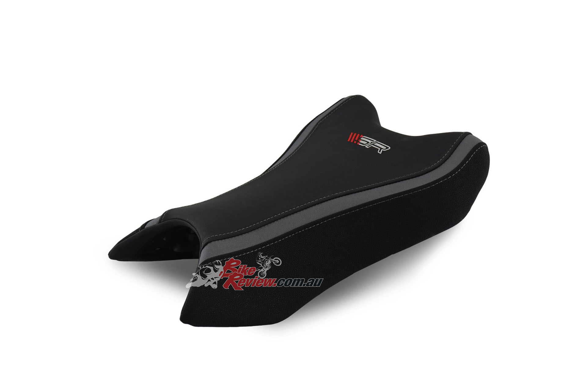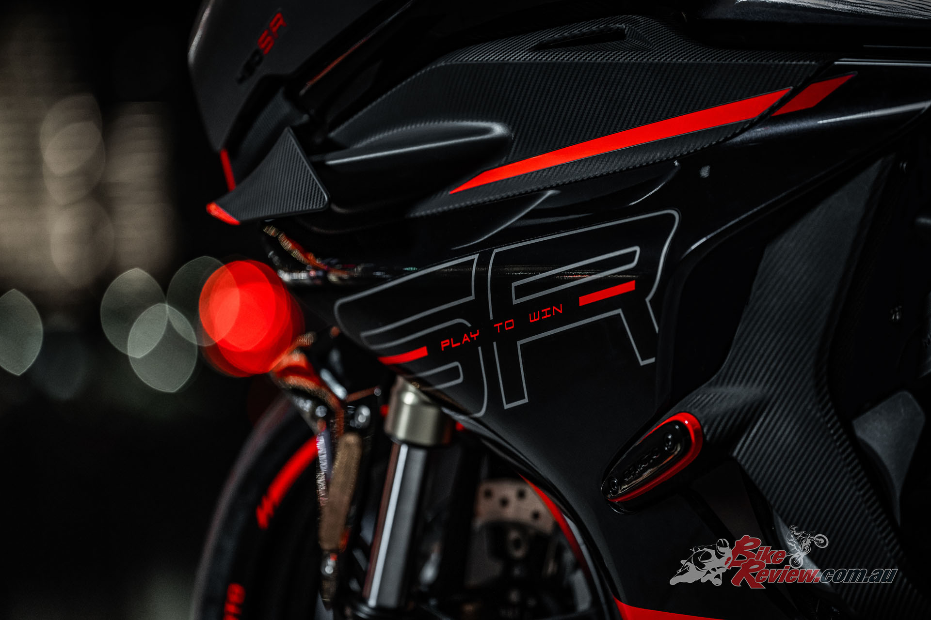 The SR line’s signature split front face line cowling design was carefully sculpted with enlarged grooves to minimise drag-loses and encloses a pair of flowing LED headlights. GP racing-derived aerodynamic winglets enhance stability by providing a claimed 1.6x downforce at higher speeds. The front indicators have been integrated within the rear-view mirrors for a streamlined appearance. The mirrors also automatically retract upon impact, either by being hit or during a fall, to help avoid additional injury.