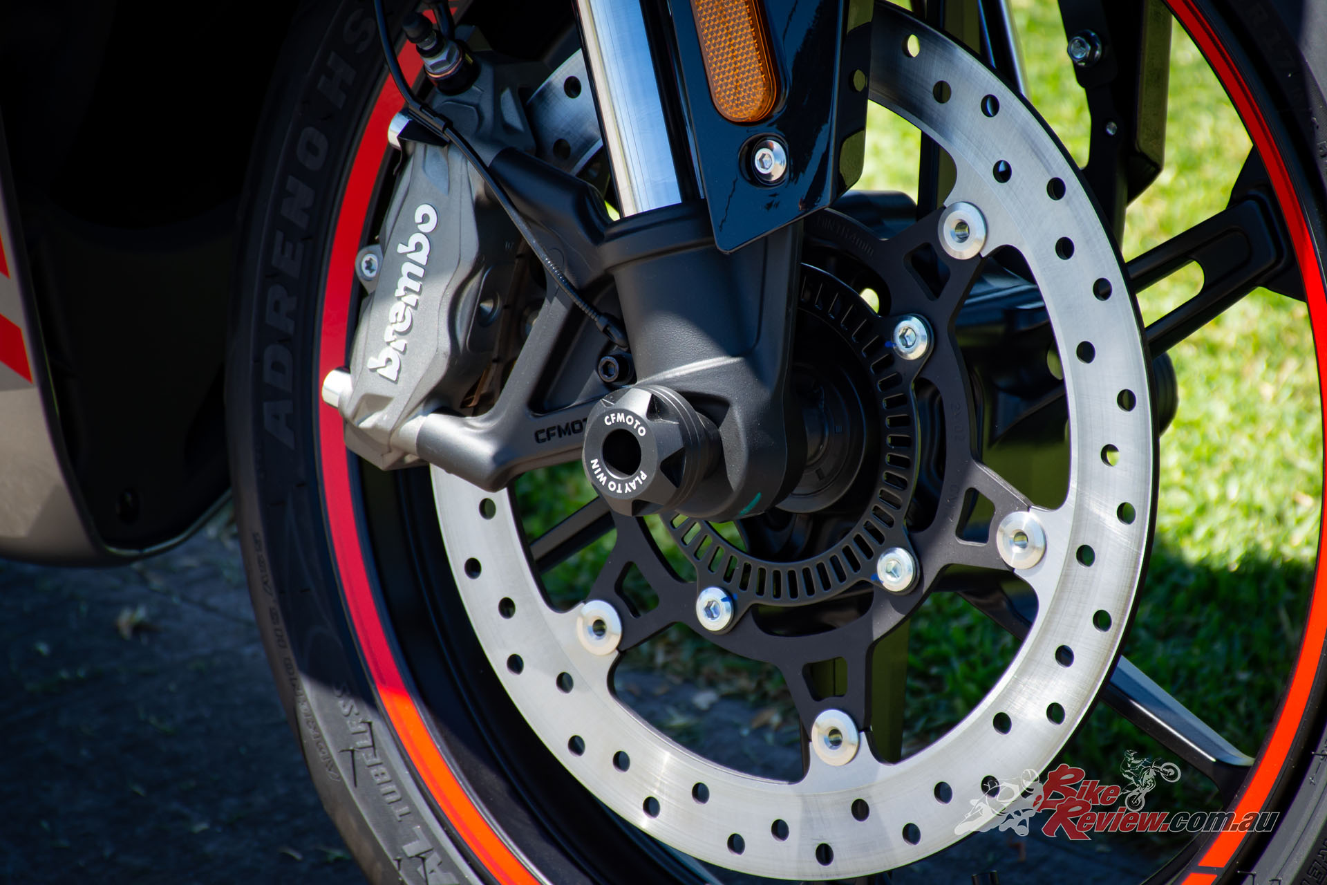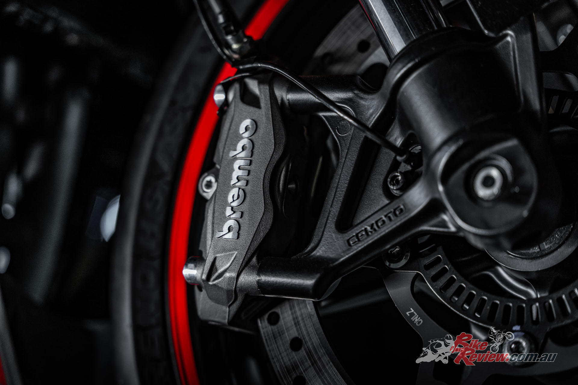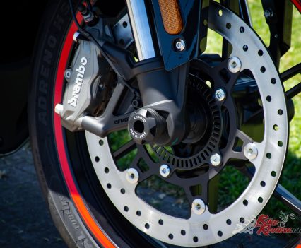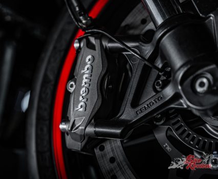 The 450SR has been outfitted with a four-piston radially mounted Brembo M40 monobloc caliper with 32mm pistons matched with a single 320mm floating front brake disc.
