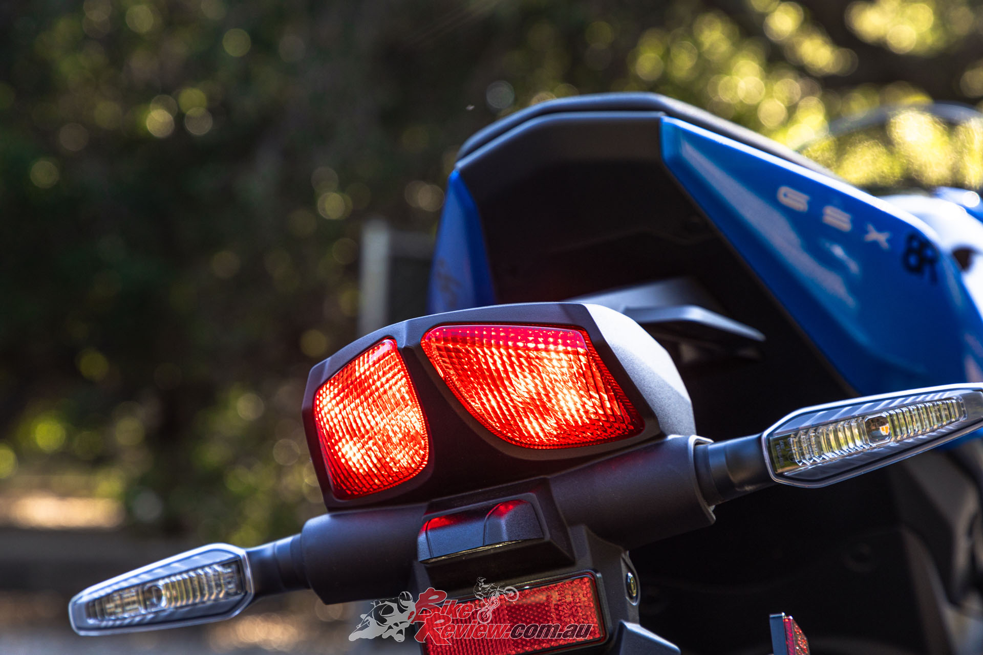 - Compact LED rear combination light and LED license plate light mounted on the slim rear fender make the GSX-8R rear end look even shorter and slimmer