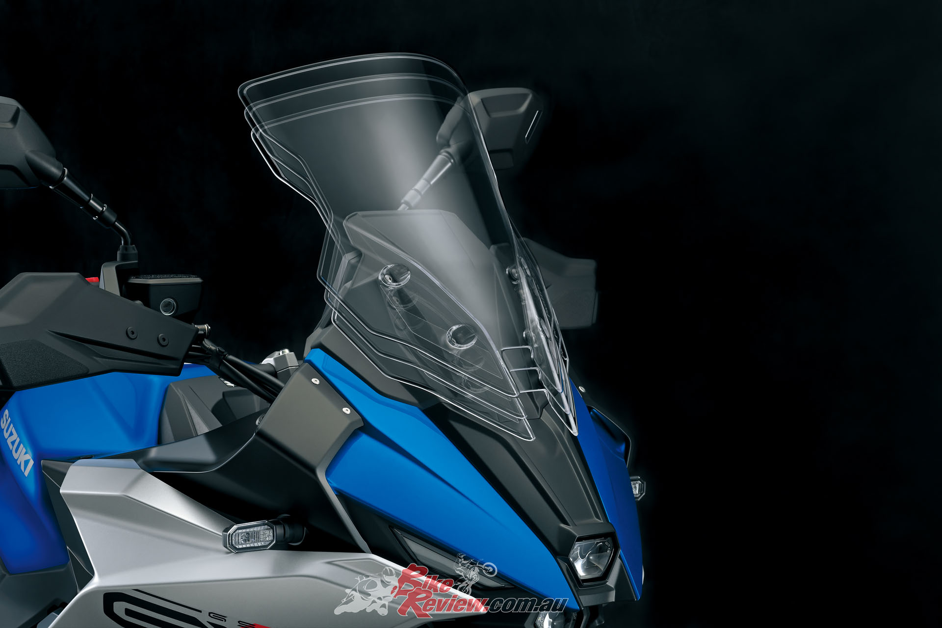 Aerodynamics and wind protection are critically important to achieving the dynamic performance and level of comfort desired when touring for long distances on a large-displacement crossover machine. Suzuki say the front cowl, windscreen and knuckle covers were all designed through a process that involved both wind tunnel testing and feedback from test riders. The windscreen’s 3-step adjustment allows it 50mm of travel, which raises or lowers the height by up to 43mm.