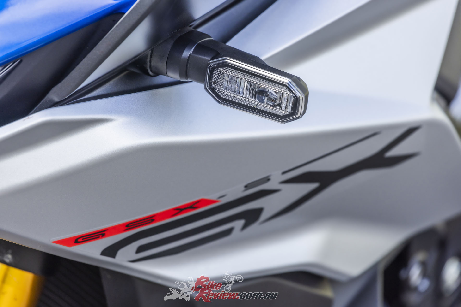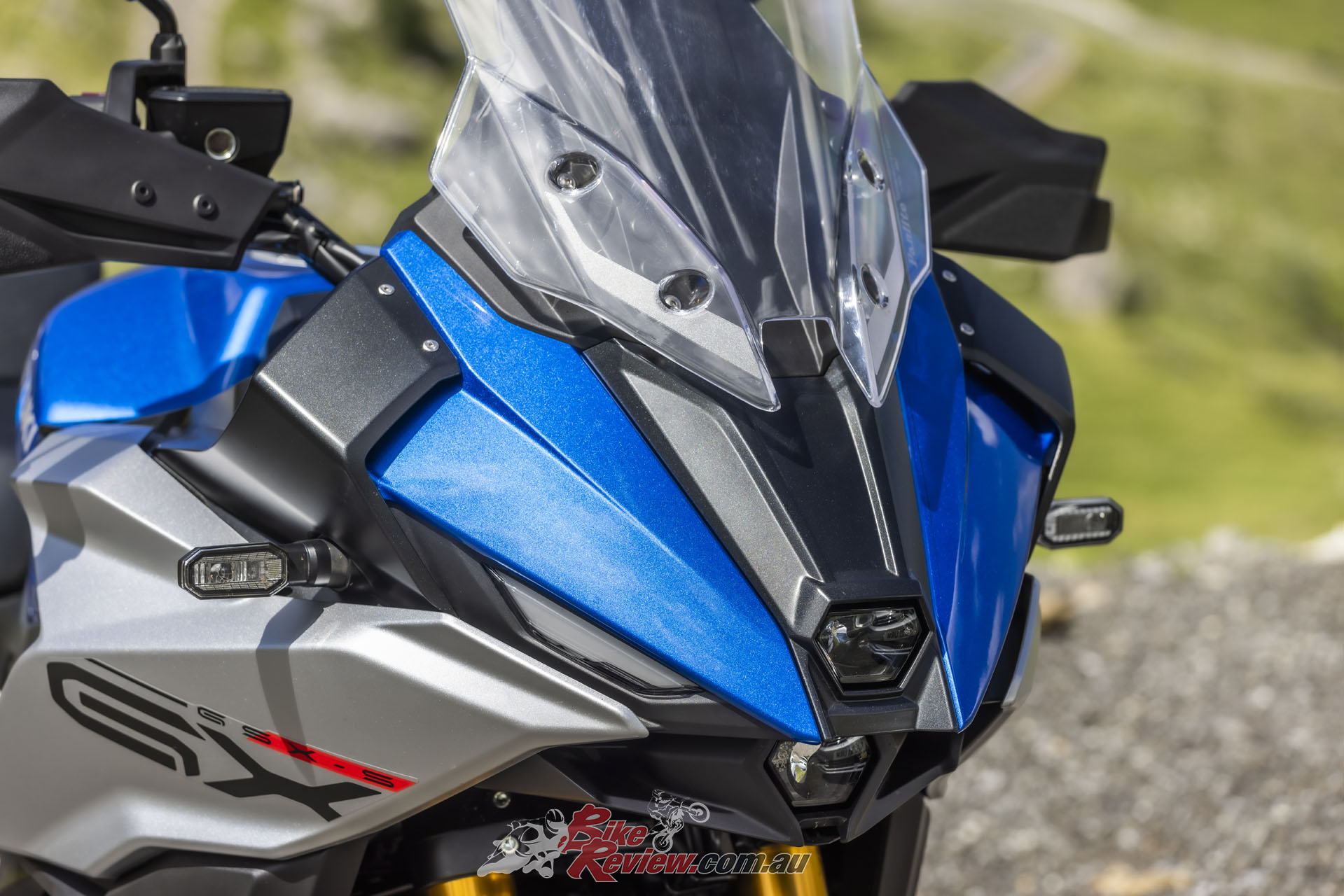 The all-new GSX-S1000GX features a sharp front cowl, protruding nose that culminates at the compact LED low- beam headlight. The headlight is flanked by LED position lights with the look of a sharp pair of “eyes”. And, of course, it’s wrapped in that Metallic Blue colour.