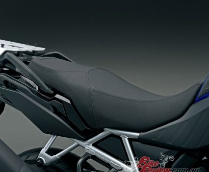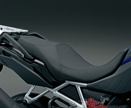 The geometry of the V-STROM 800 is more road focussed, the trail up from 114 to 124mm and rake reduced from 28º to a sharper 26º angle. Wet weight of the bike comes in at 223kg, around 7kg less than the DE version. The ‘pegs are positioned 7mm higher and 14mm further back.