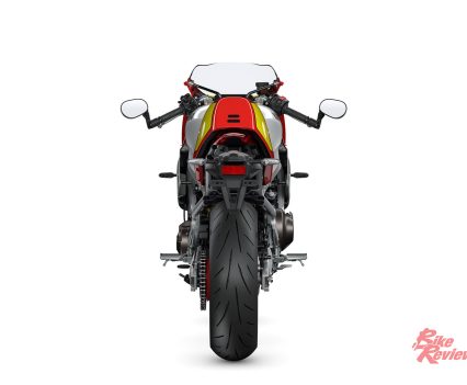 The bodywork is not only a symbol of the past in looks alone, but the method in which it is fixed in position is also inspired by the 1980s, with a tubed structure connecting the cowling to the frame and straight brackets supporting the dash creating a rider’s view with a genuine golden era feel.