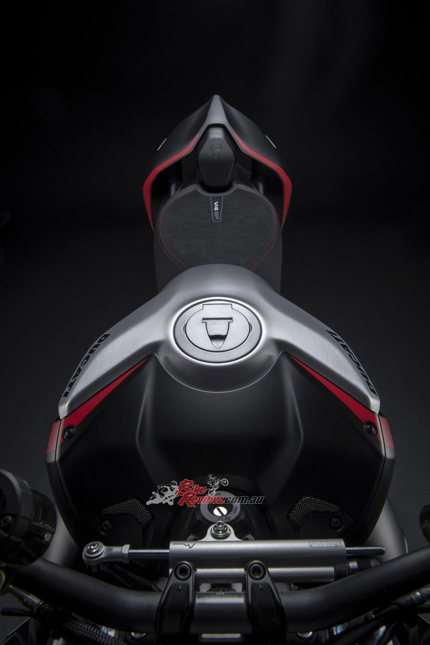 Ergonomics has major rider-centric features and is focused on road use with the added values of sportiness and comfort. The high and wide aluminium handlebars replace the handlebar risers of the Panigale V2. The saddle now is wider and has new padding that contributes to make this bike even more comfortable. In addition, the footpegs have been repositioned to increase the amount of room.