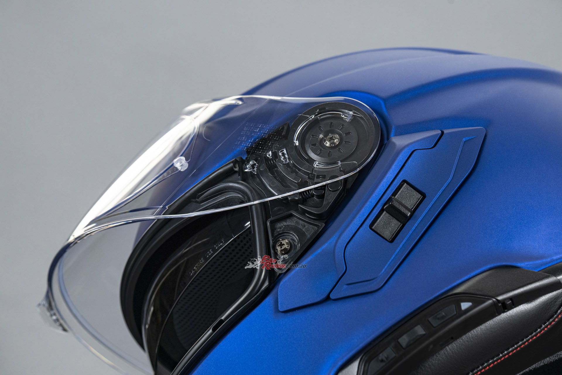 Improved helmet aerodynamics led to a change in visors, with the GT-AIR 3 sporting a larger field of view, centre locking mechanism, new idents allowing a ‘slightly open’ setting to prevent fogging and new wind noise reducing vortex generators behind the visor to deflect wind around your ears to reduce the noise.